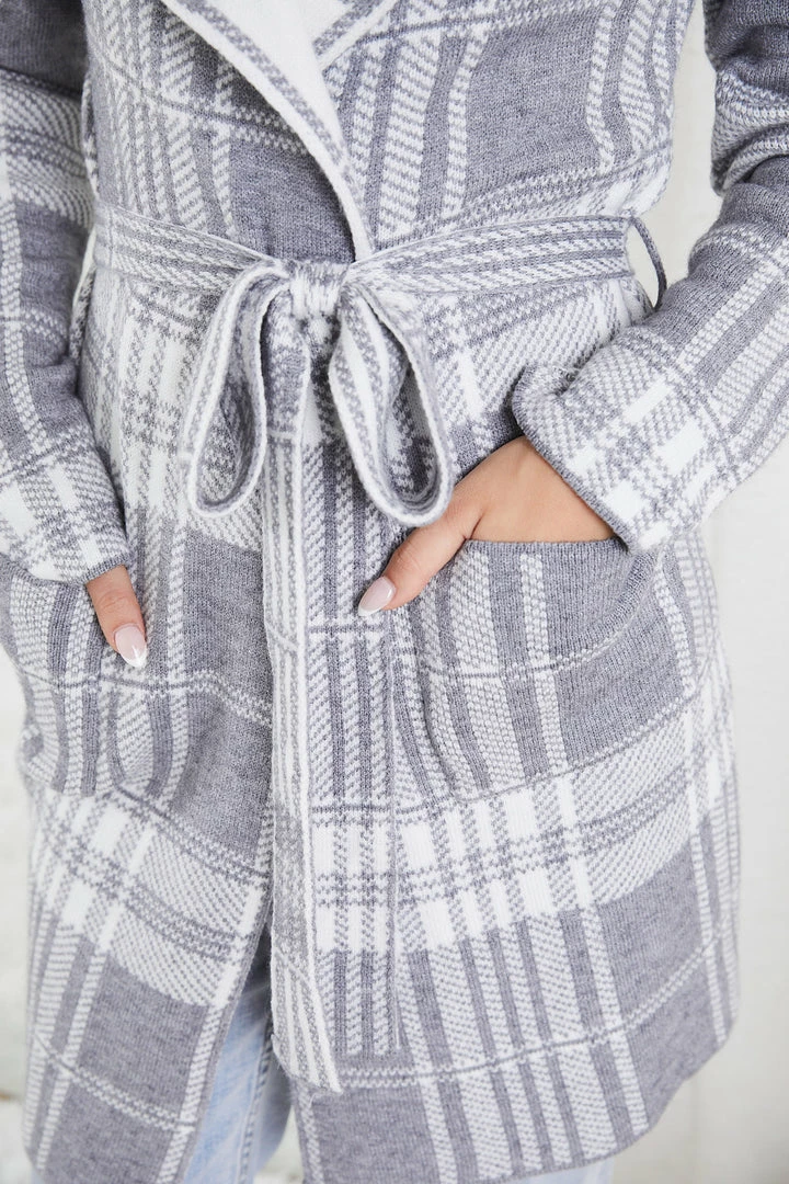 Our Caesarea Coat comes in grey and white plaid print. Catch the winter vibes in a polished look in this long sleeved jacket featuring a wing collar, mid length hem and an adjustable tie belt to accentuate your waist. Pair with flared pants for a relaxed chic outfit.