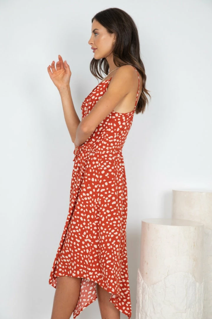 Our Cesarina Dress comes in a rust-tone base with white spot prints. It features a carefree v neckline, sleeveless, and an asymmetric skirt. This flowy midi pairs beautifully with heels for a relaxed summer look!