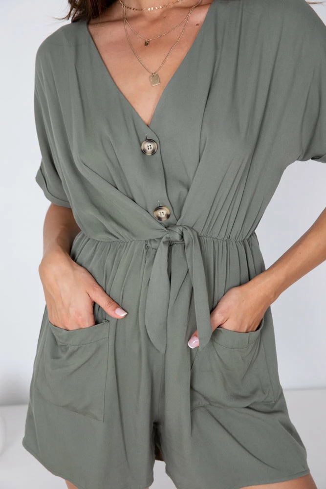 Our Clava Playsuit comes in a khaki tone and is perfect for those hot summer days. The V neckline met with buttons down the center of the dress, rolled up sleeves, gathered detailing on the waist, and fabric waist tie to cinch the waist makes this piece both practical and comfortable. Pair with your favourite tan sandals for an effortless look!