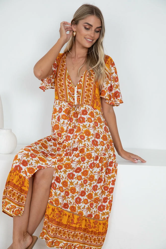Our Ersilia Dress comes in a mustard tone base, with yellow, orange, and white tone print. It features a v neckline and short sleeves. This flowy midi pairs beautifully with heels for a relaxed summer look!