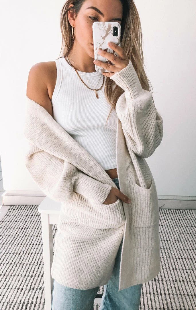 Our Marvel Cardigan is a gorgeous creamy beige in a relaxed fit. This oversized open style features bishop long sleeves with cinched extended cuff and a drop shoulder that is effortlessly chic. Pair with your fave denim and white tee.
