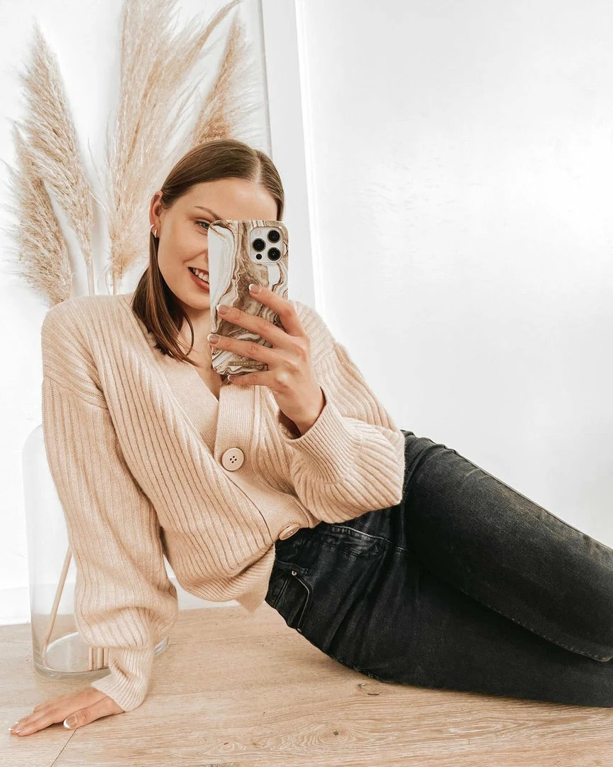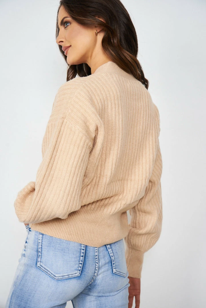 Our Consuela Cardigan comes in a mocha tone. It’s a gorgeous medium weight material ideal for tying together an outfit. The V neckline and oversized buttons are a fun addition to this cardi. The drop shoulder design and balloon long sleeves are cinched at the cuffs. The ribbed material in this classic shape will stay in your wardrobe for years to come.