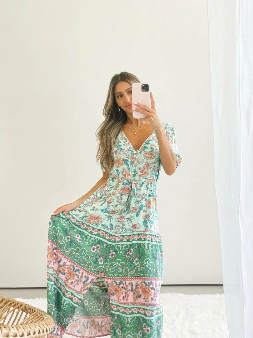 Our Erminia Dress comes in an aqua tone base, with an olive, rose, peach, and blue tone print. It features a v neckline, short sleeves, fabric waist tie, and buttons down the front. This flowy midi pairs beautifully with heels for a relaxed summer look!