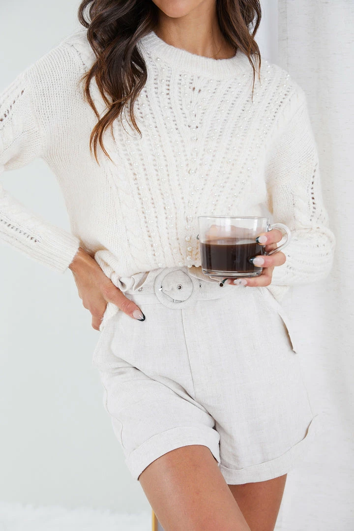Our Karissa Knit comes in a neutral beige tone. It features a round neckline, long relaxed sleeves, and an embroidered pattern across the chest. This cute knit is perfect for layering during the cold winter months!