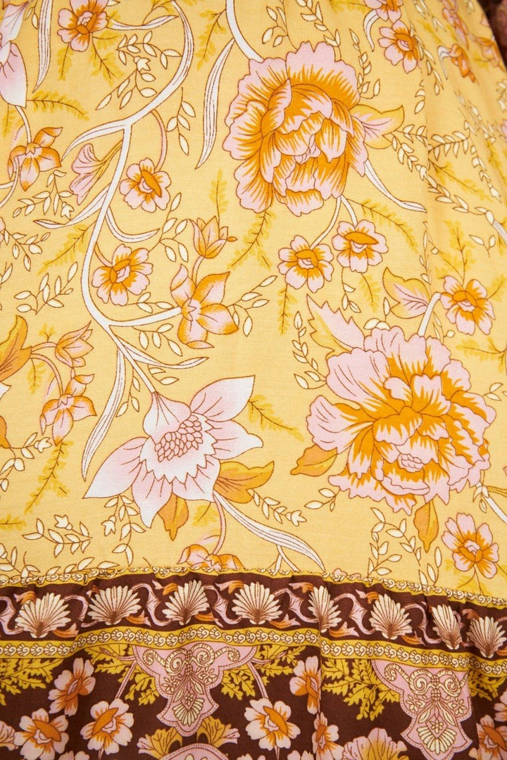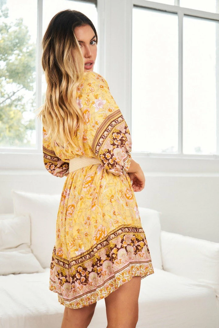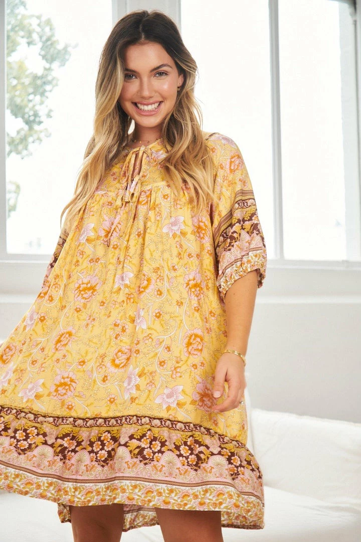 Our Luisyana Dress is a vibrant yellow, olive, dark mustard, brown & cream-toned floral print mini in a peasant-style dress that oozes fabness! The v neckline has a tie detail featuring a tassel that adds texture to the top. The balloon short sleeves are a fun & flirty addition to the wardrobe.