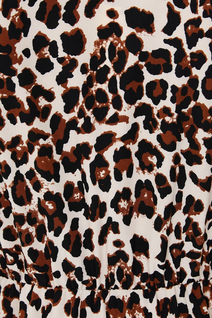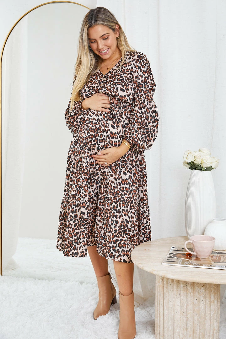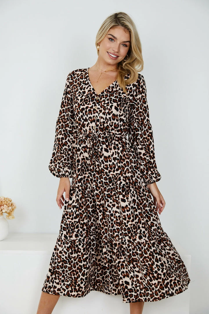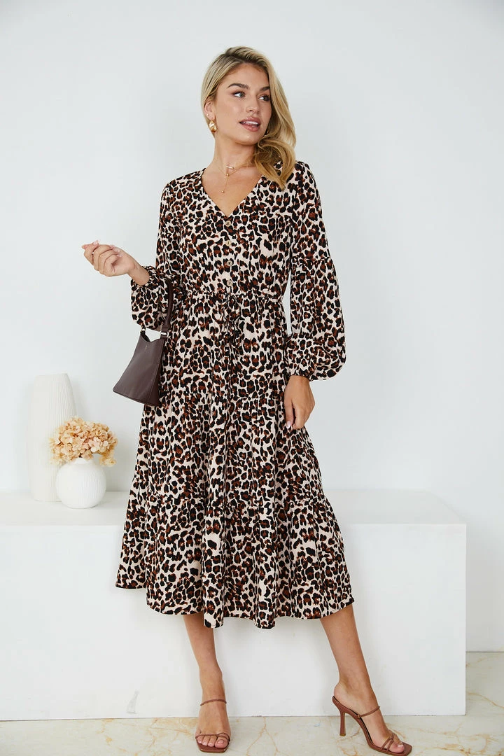 Our Merlyn Dress comes in a leopard print. This features a v neckline, long cinched cuffs, and a fabric waist tie to flaunt the waist. The relaxed fit pairs beautifully tan heels, and gold accessories.