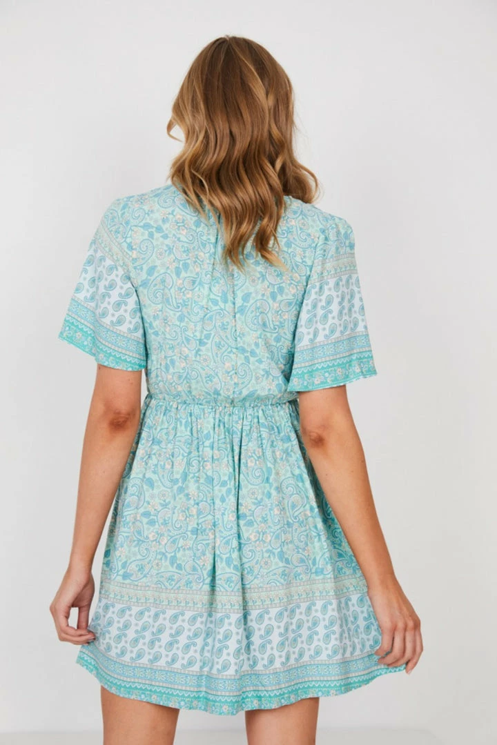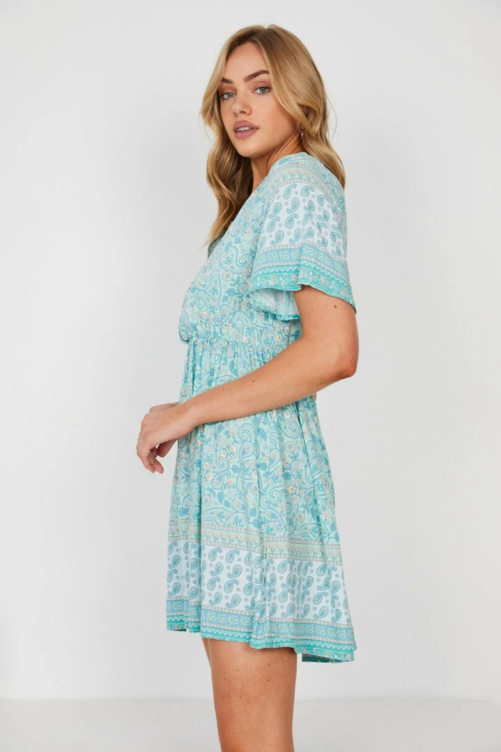 Our Ricarda Dress features a sage base with blue prints. It’s a gorgeous lightweight material ideal in a relaxed mini dress silhouette that is perfect for days spent in the sunshine. The V neckline is met with buttons making this ideal for breastfeeding. The short sleeves flutter out and are a feminine complementary feature to the gorgeously gathered waist detailing of the garment.