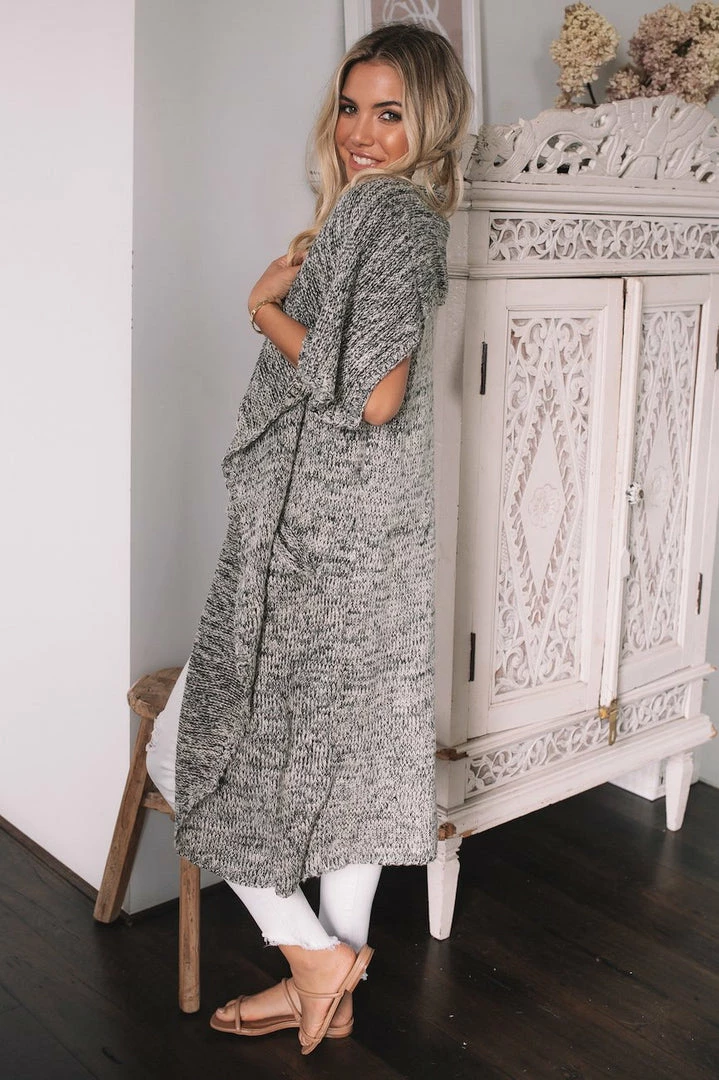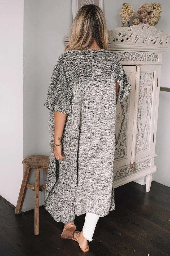 - Key Features: Midi length. Relaxed fit. Waterfall style. Short open sleeves. Curved hemline on front. Maternity friendly. Black, grey & cream variegated knit.