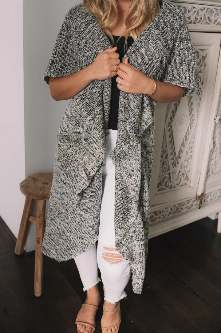 Our Tokito Vest is a heathered black and grey toned open vest. The waterfall style elegantly drapes on the body and pairs beautifully over your fave bodysuit and denim bottoms.