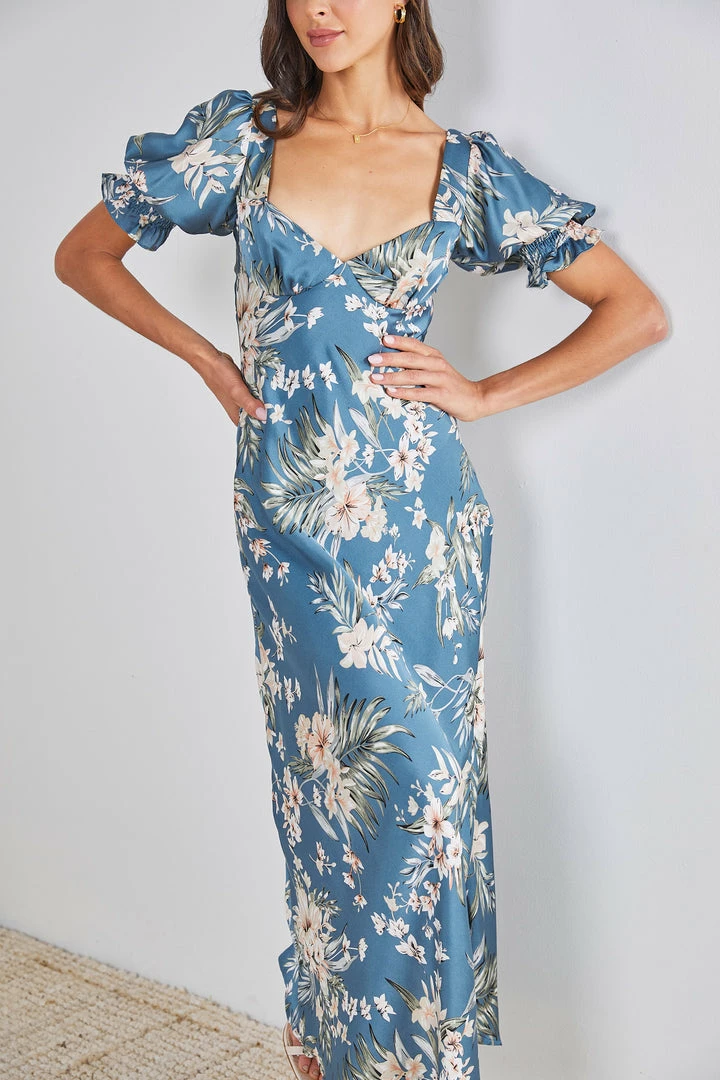 - Key Features: Puffed sleeves. Sweetheart neckline. Floral Print. Maxi Length. Invisible side zipper.