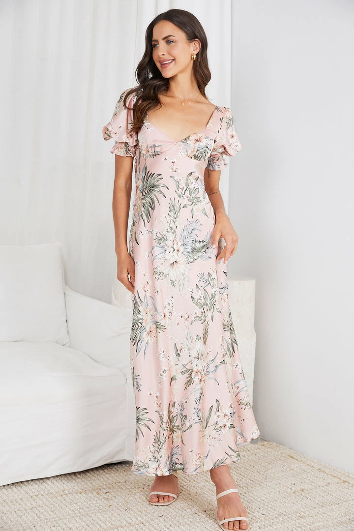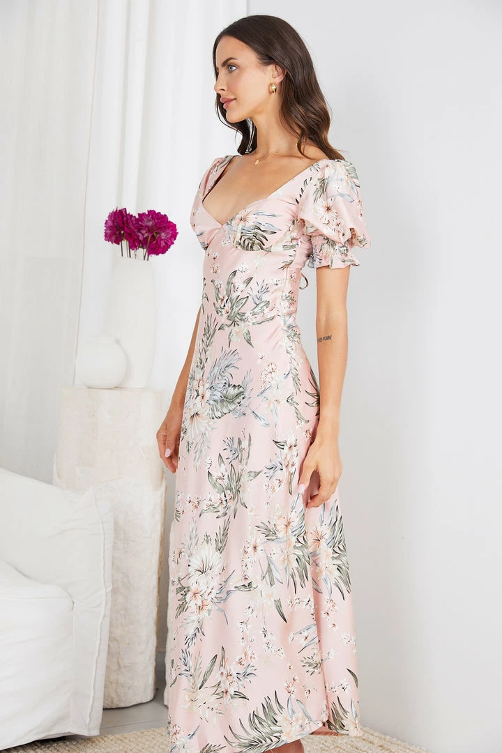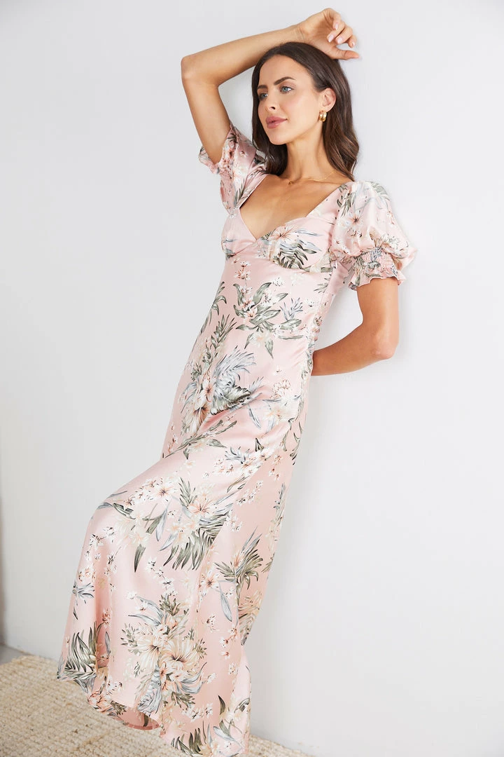 - Key Features: Puffed sleeves. Sweetheart neckline. Floral Print. Maxi Length. Invisible side zipper.