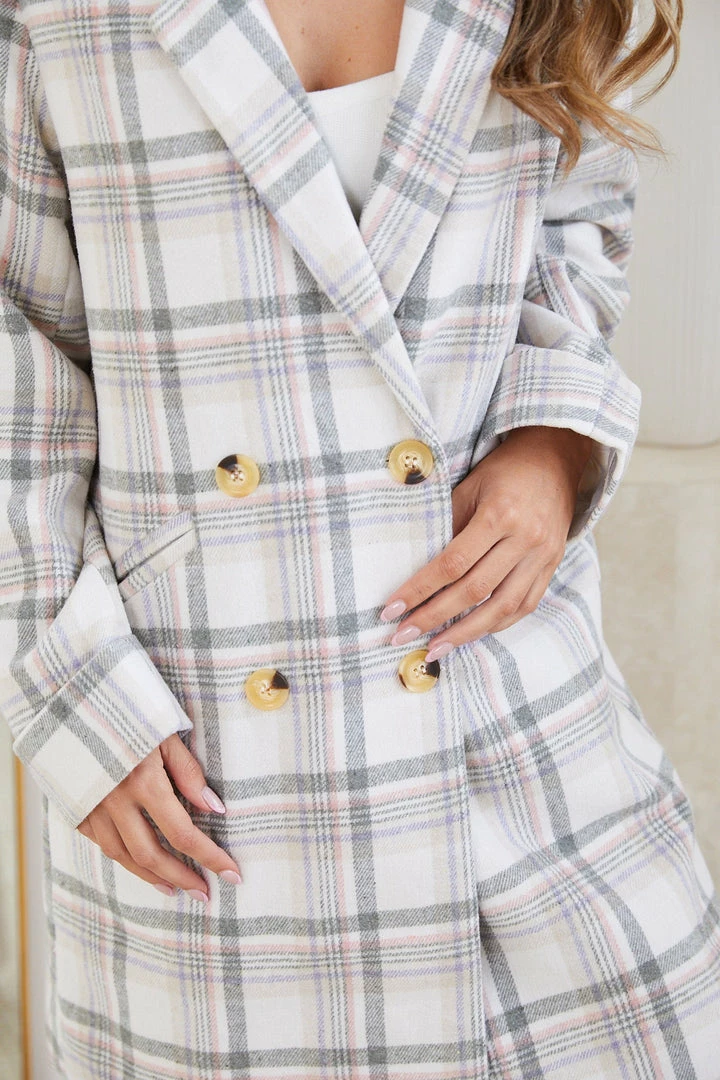 Our Aezith Coat comes in a cream base with grey and pink check pattern. A stylish piece everyone will be clamoring over, this outerwear features a notched collar, long sleeves folded on the cuffs, mid-front buttons, angled double welt pockets and knee-length hem. Spice up your look by pairing this with knee length heeled boots and geometric sunglasses!