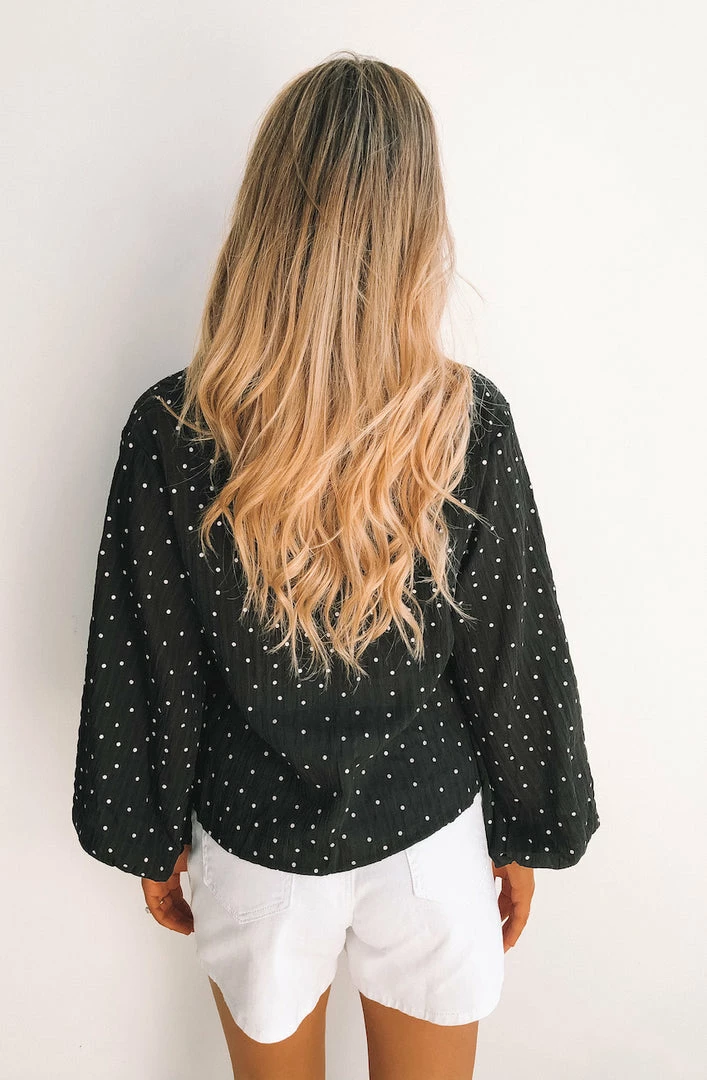 Our Sakura Blouse is a black base with white spot print. It’s a gorgeous lightweight material with a sheen feature. The v neckline is met with buttons making this ideal for breast feeding. The balloon sleeves are cinched at the cuff with shirred detailing.