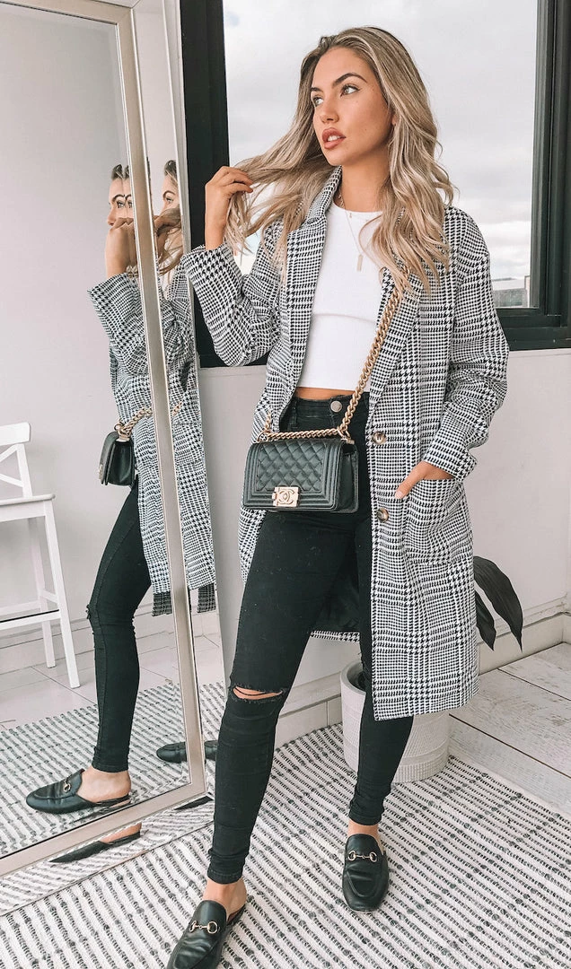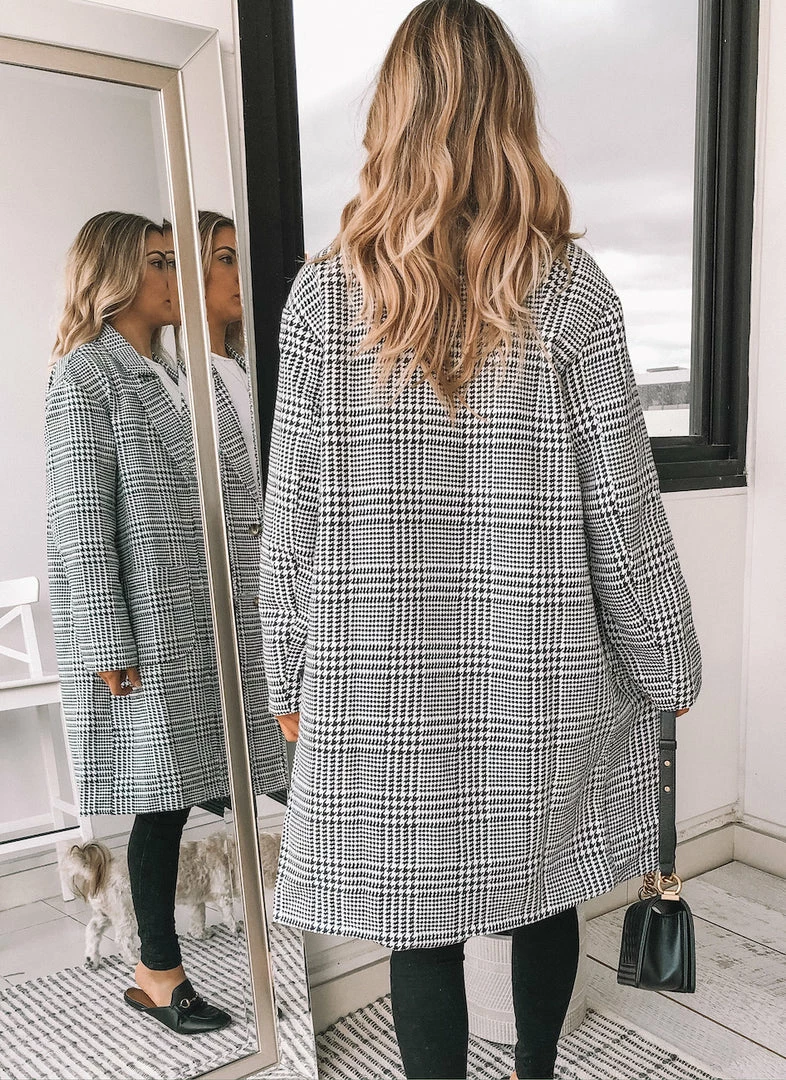 This stunning coat is a must for this season! The black, white and grey plaid print is a beautiful colour palette to add to your wardrobe! This coat would be amazing paired with black jeans or leggings with a basic tee!Â