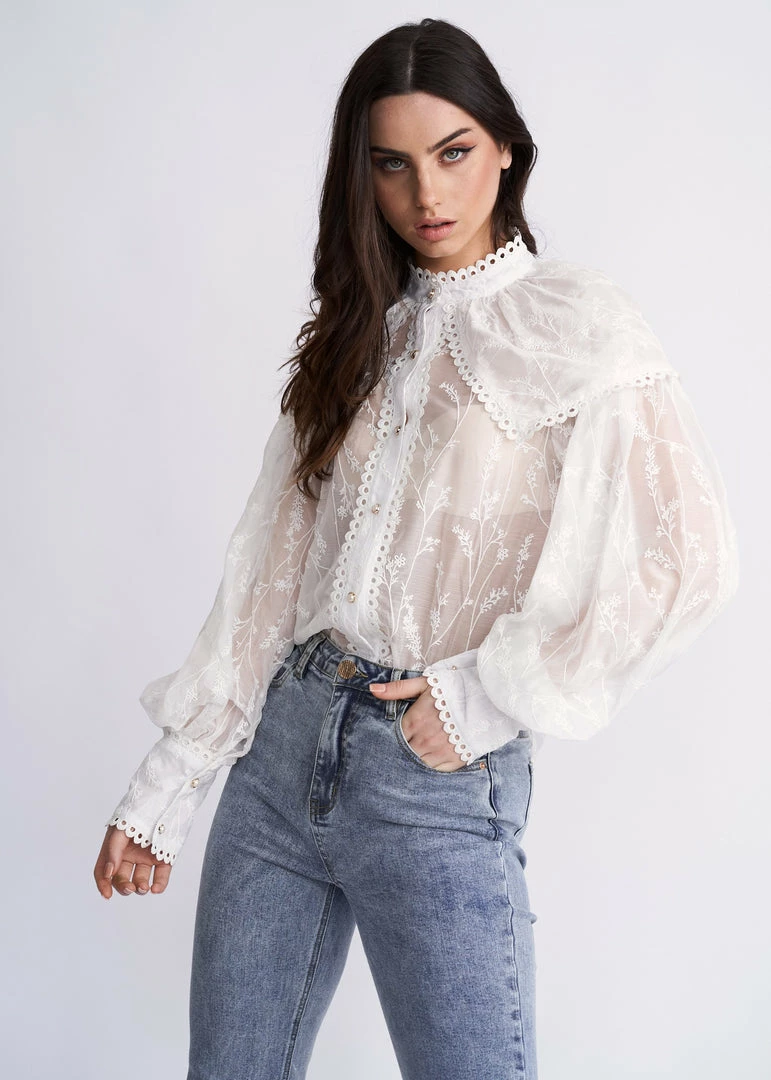 Our Harmony Shirt comes in an ivory white tone base. It features a high neckline, long sleeves, buttons down the front, and an embroidered pattern all over the garment. This top pairs beautifully with basic pants for a stunning look this spring season!
