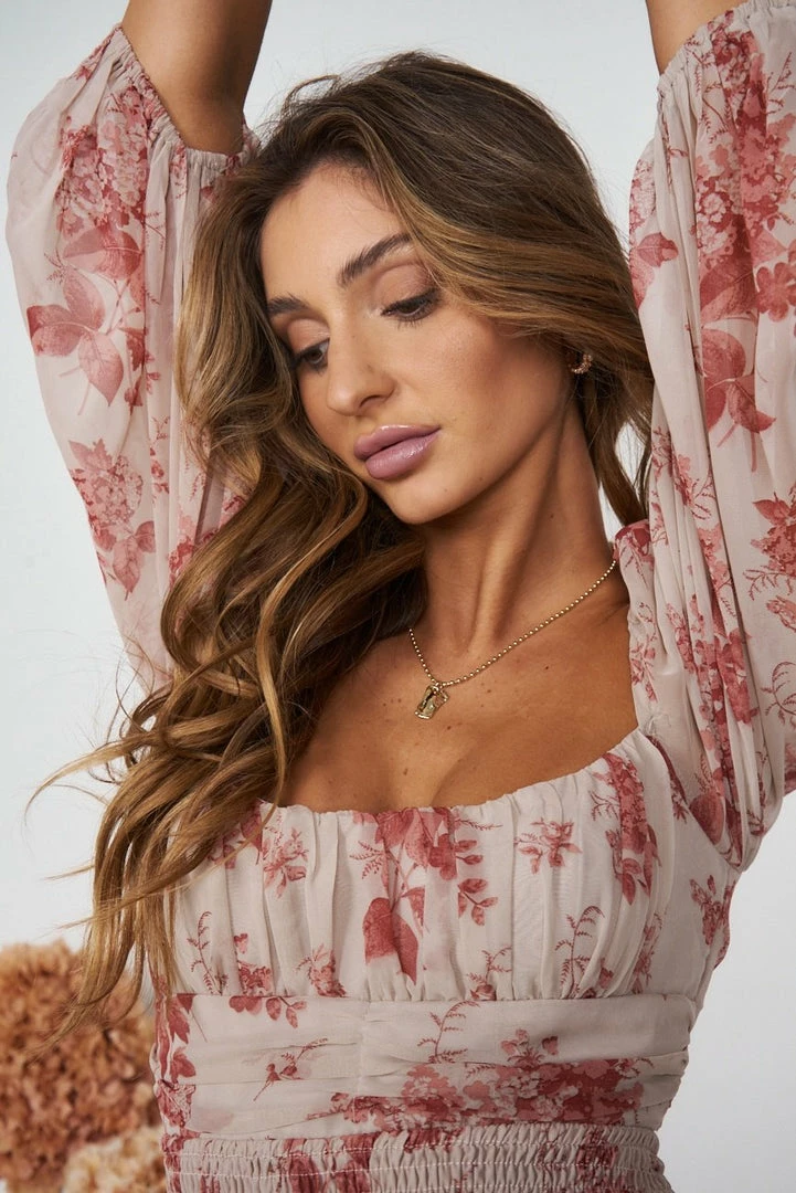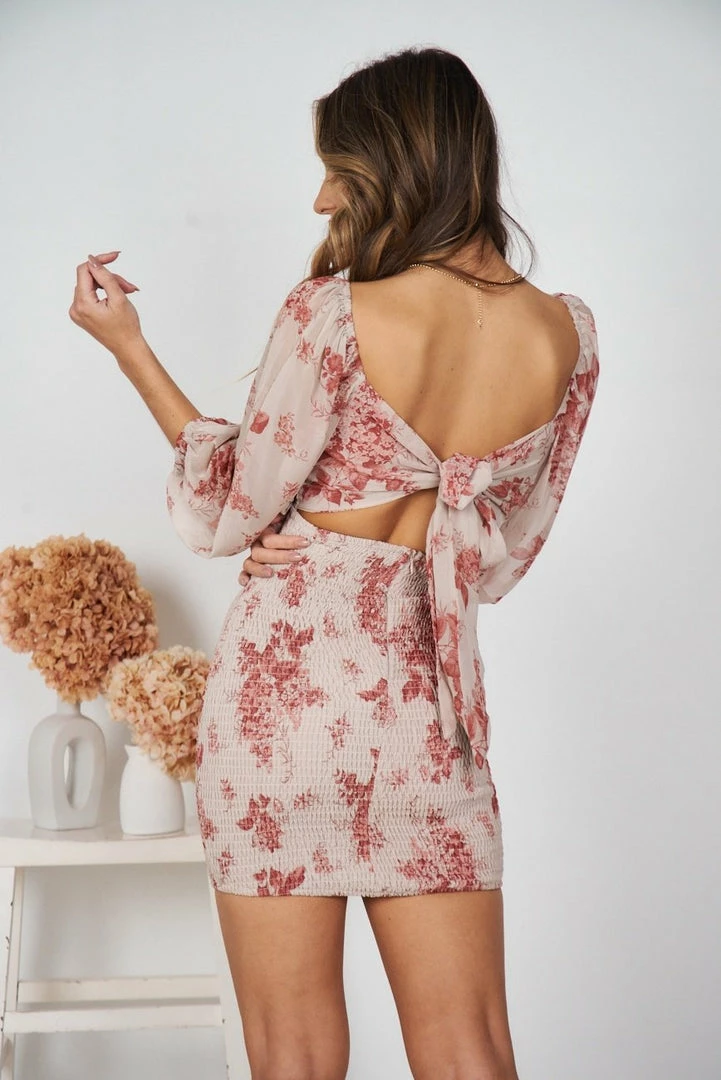 Our Nigella Dress comes in a beige tone base, with a soft red floral print. It features a square neckline, long bishop sleeves, and a fabric tie to bring the dress together at the back. This gorgeous mini pairs beautifully with heels or sandals for an effortless transseasonal look!