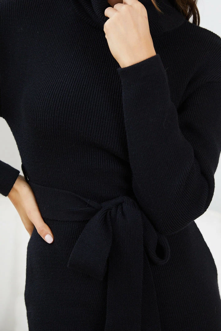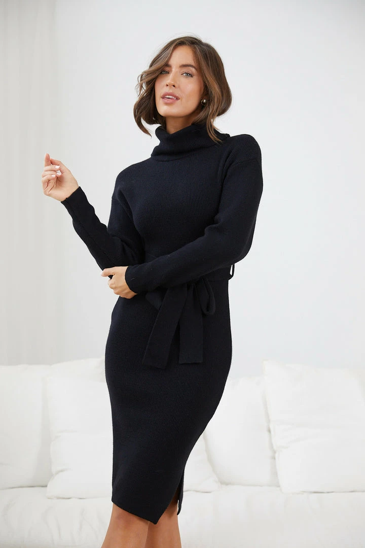 Our Pitcher Dress is a deep black tone. It’s a gorgeous medium weight knit material ideal for your next date night. It’s a relaxed bodycon fit with drop shoulder and turtleneck detailing making this a fun work dress. A modest split is featured on the wearer’s left. A fabric waist tie is included to cinch the wearer’s waist.