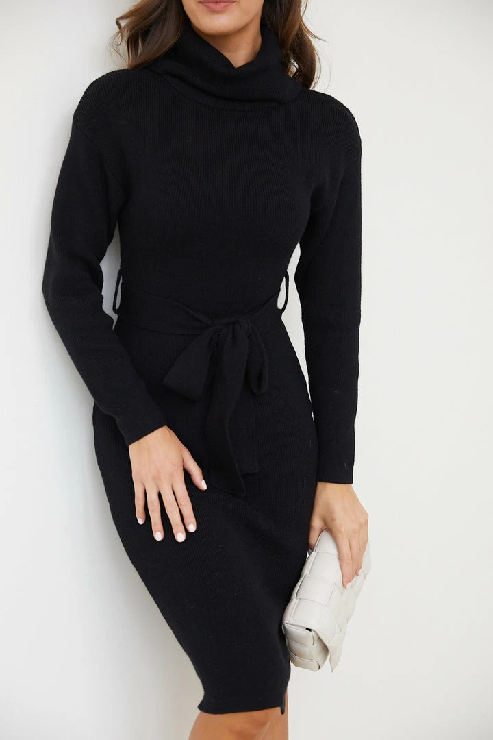 Jayde is 175 cm tall and has an 81 cm bust, 62 cm waist, & 93 cm hips. She is wearing an XS / AU 6 / US 2. This dress is true to size.- Key Features: Turtleneck. Bodycon fit. Side split on skirt. Fabric waist tie.