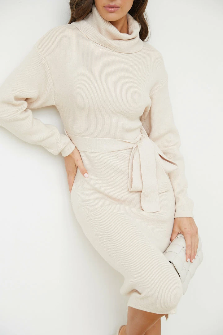 Our Pitcher Dress is a delicate beige tone. It’s a gorgeous medium weight knit material ideal for your next date night. It’s a relaxed bodycon fit with drop shoulder and turtleneck detailing making this a fun work dress. A modest split is featured on the wearer’s left. A fabric waist tie is included to cinch the wearer’s waist.