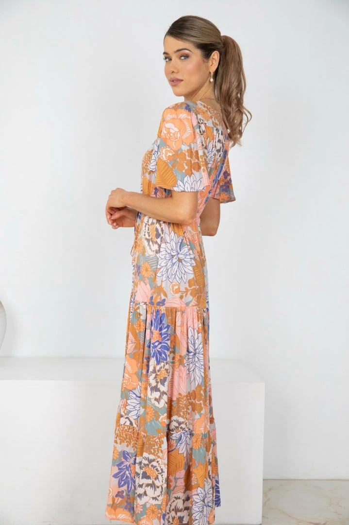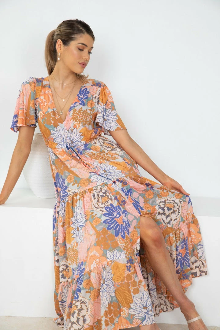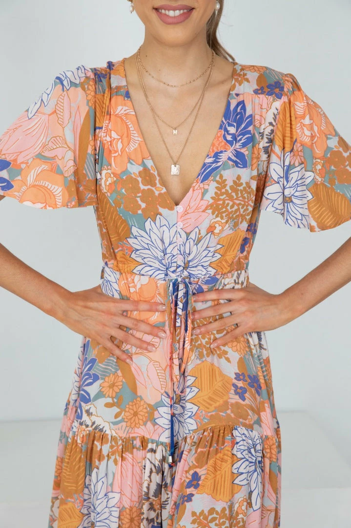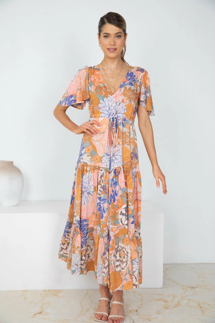- Key Features: Maxi length. Short relaxed sleeves. V neckline. Buttons on front. Adjustable waist drawstring. Frill detailing on skirt.
