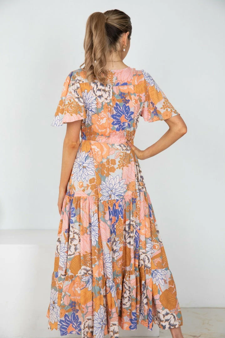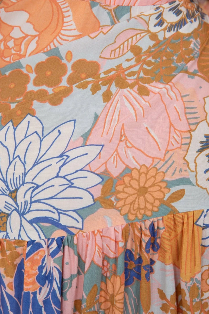 Our Birdette Dress is a multi-colour floral print. It’s a stunning medium-weight material with a generous skirt perfect for the transition to Spring and those with growing bumps. The v neckline is breastfeeding-friendly as it features buttons. The adjustable drawstring on the waist and the layered frill skirt make this a comfortable and generous style, perfect for all figures!