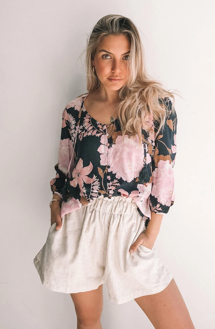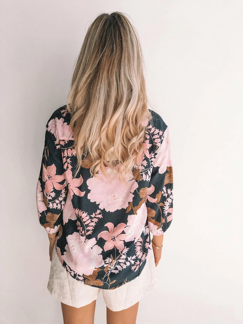Our Marha Top is a moody navy & pink floral print. This lightweight top is comfortable and casual, best paired with a black skirt, pants or shorts.