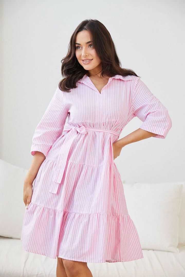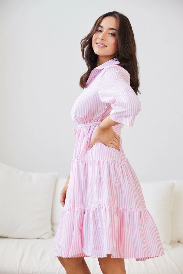 Our Fernina Dress comes in a clean white base with pink stripe patterns. A colour therapy to brighten your day, this knee grazing piece is designed with a johnny collar, folded elbow length sleeves, tiered skirt and a fabric waist tie. Complement it with pastel blue shoes!
