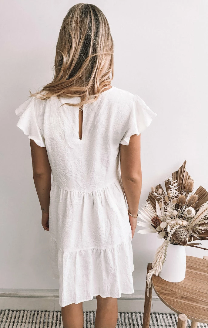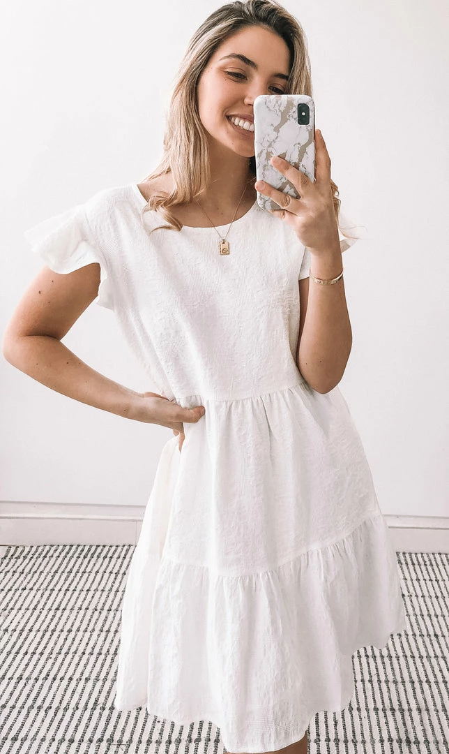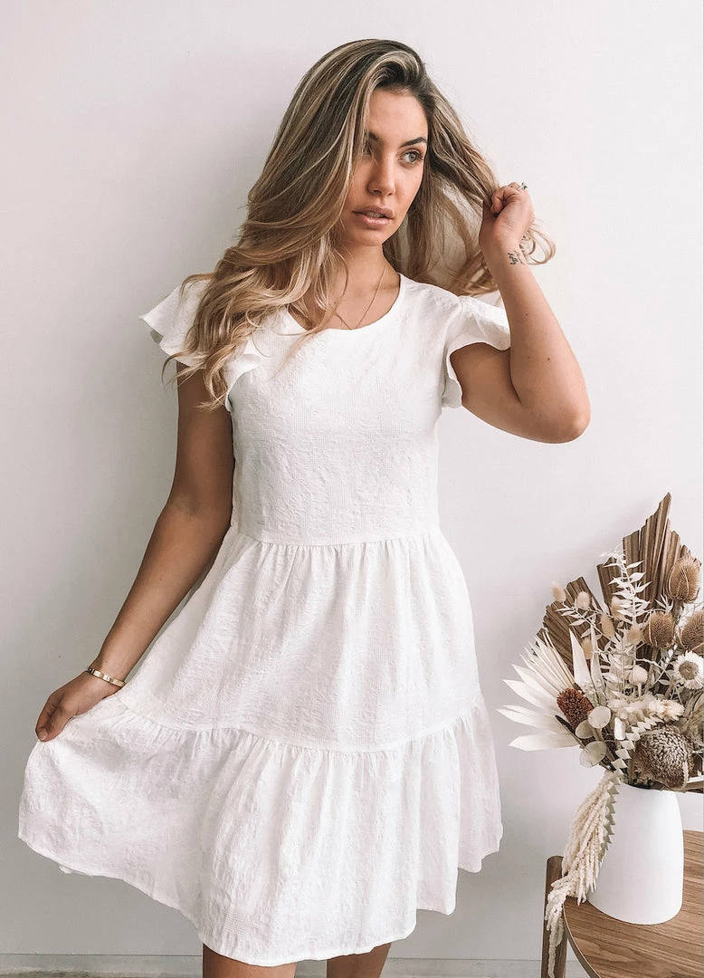 Our Balandra Dress is a crisp white. It’s a gorgeous medium weight in a relaxed babydoll style fit perfect for growing bumps. The butterfly sleeves & layered frill skirt are gorgeous feminine touches to this summery dress. Pair with your fave knee high boots for a more wintery look.