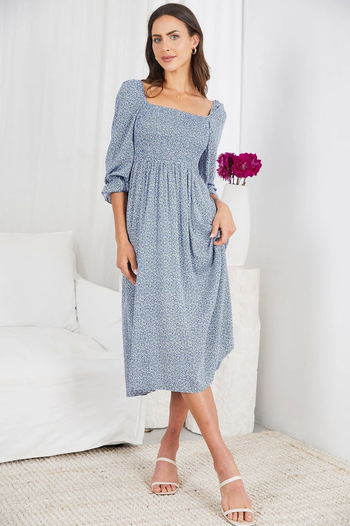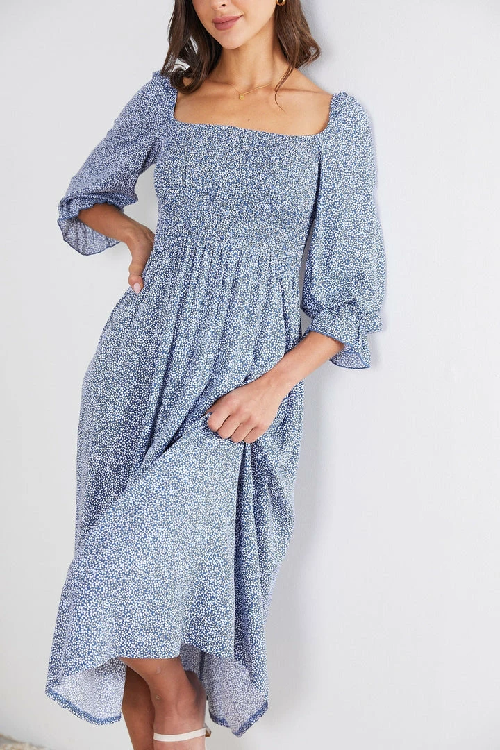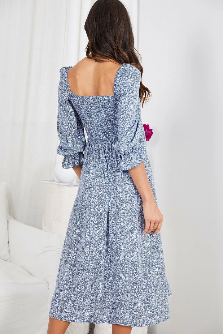Our Cherise Dress comes in a blue tone with prints. A refined charming piece, this midi features a square neckline, quarter length poet sleeves, and an a-line silhouette. It matches beautifully with espadrilles heels and hoop earrings.