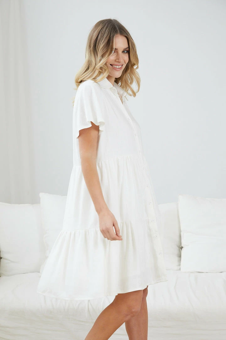 - Key Features: Linen blend. Classic collar. Short flutter sleeves. Tiered skirt. Functional buttons.