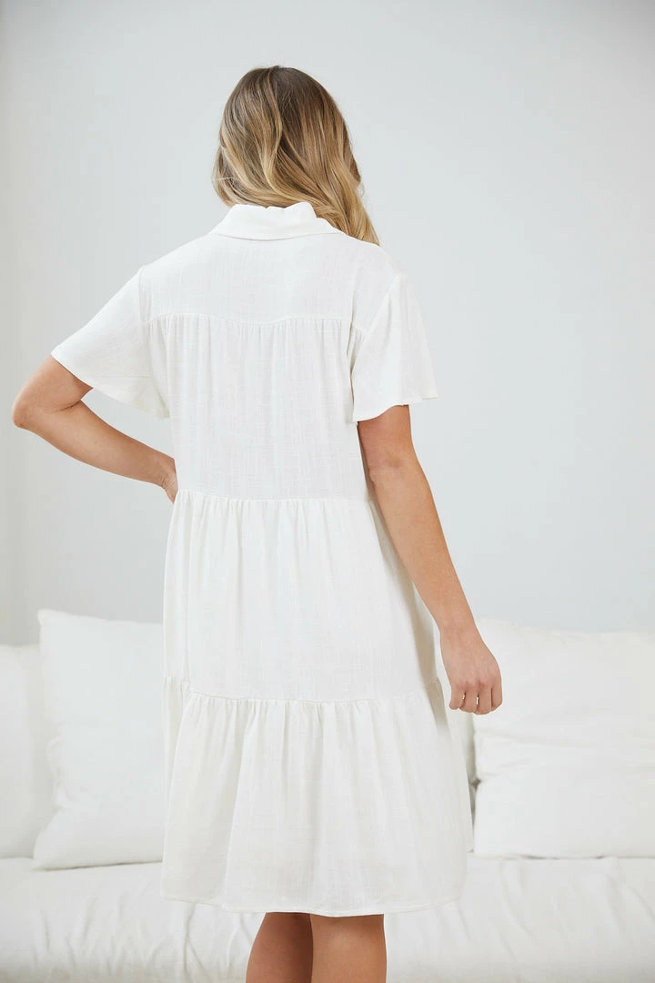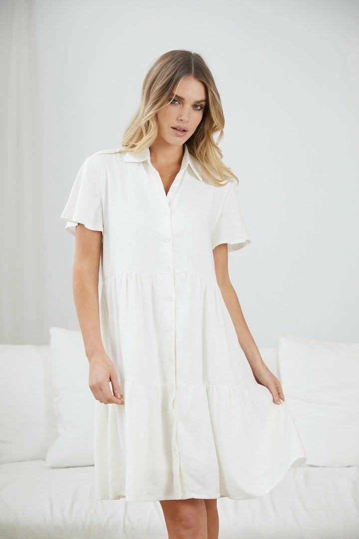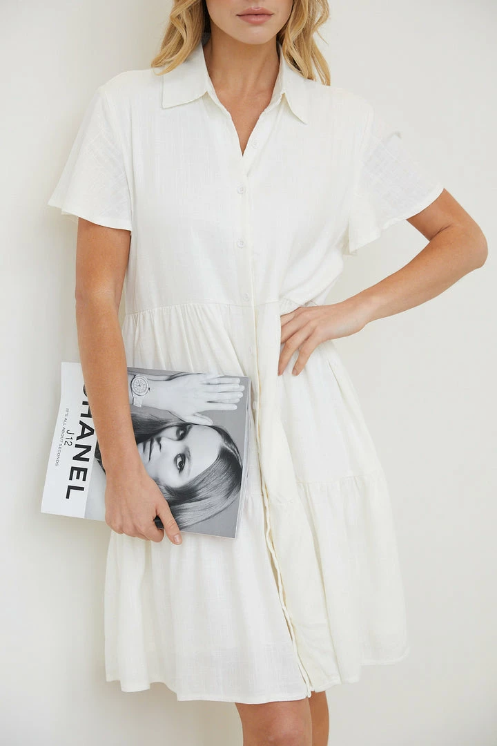 Our Calabria Dress comes in an oyster white colour. Because bright and sunny days call for a breezy lightweight fabrication, this mini is designed with a linen blend textile, classic collar, short flutter sleeves and tiered skirt. Be playful by matching this with a variety of shoes from sneakers, flats to heels!