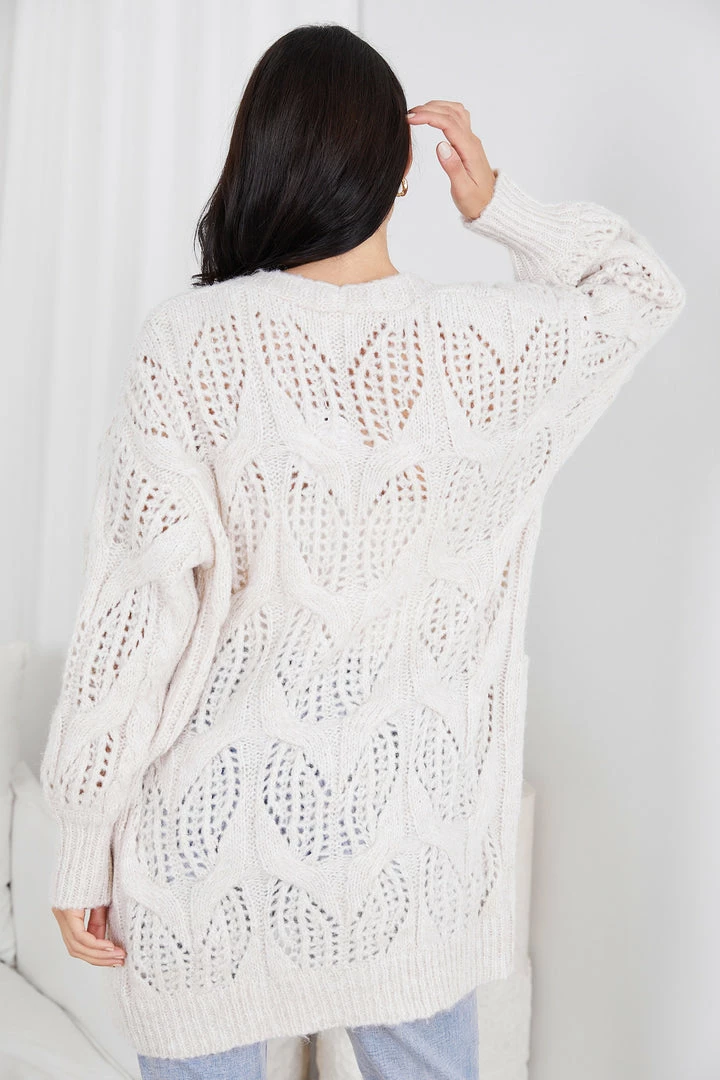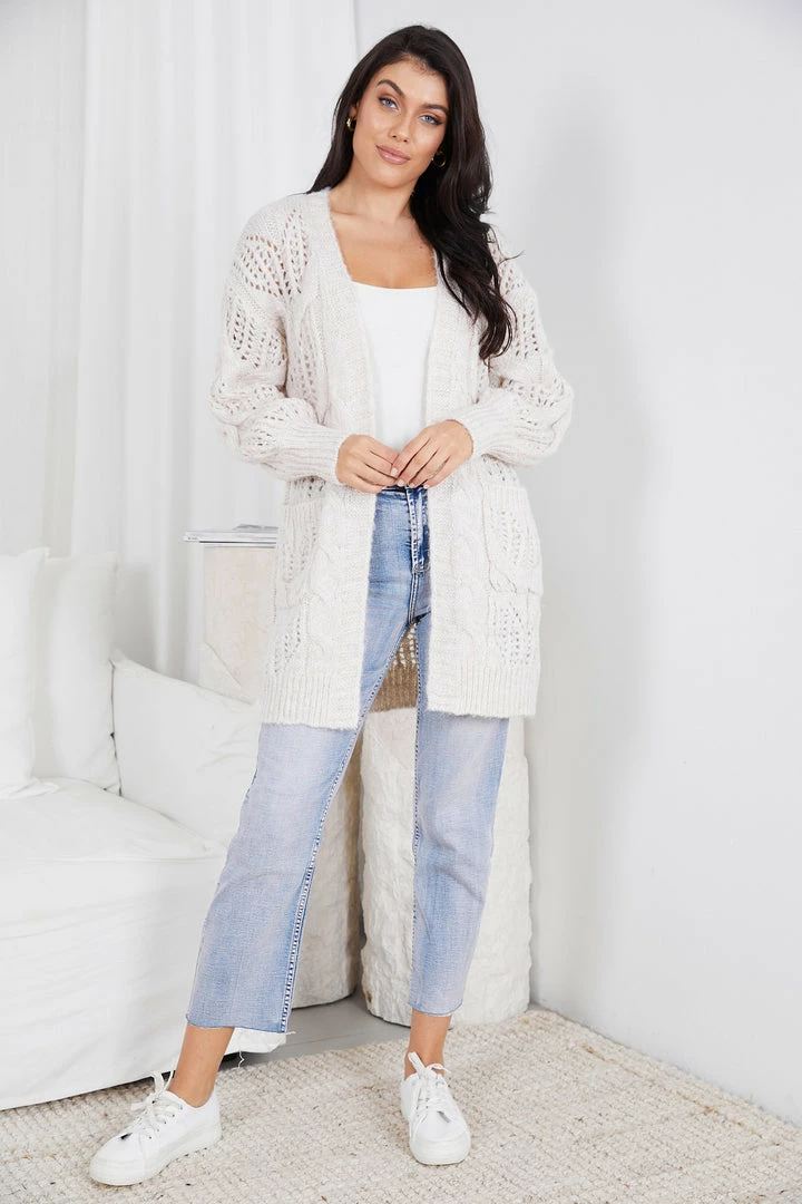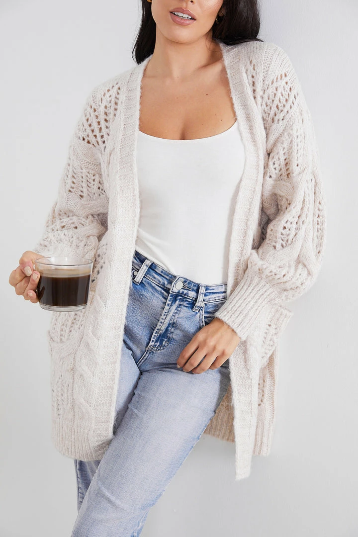 Our Chelly Cardigan comes in a stunning beige colour. Like a mug of hot chocolate, this outerwear will make you feel warm with its wool blend fabrication and long relaxed sleeves. The pocket on the side is functional for practicality and the pattern on the fabric is a feminine addition that’s great to pair with a strapless top and comfortable pants.