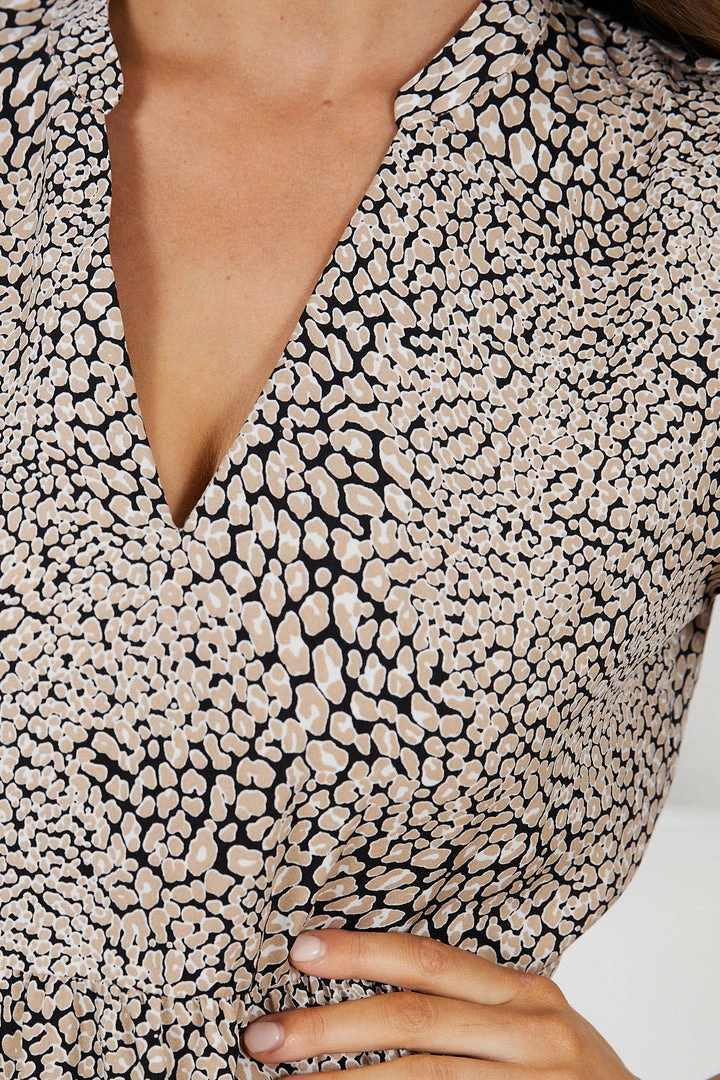Our Greet Dress comes in a black tone base, with a white and mocha tone snake-style print. It features a v-neckline, long bishop sleeves and a tiered skirt for a comfortable fit. This flowy midi pairs beautifully with boots or heels for an effortless trans-seasonal look!