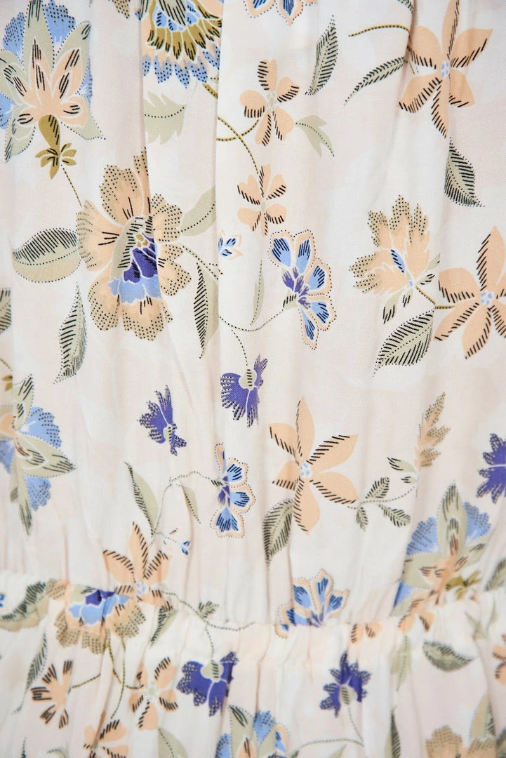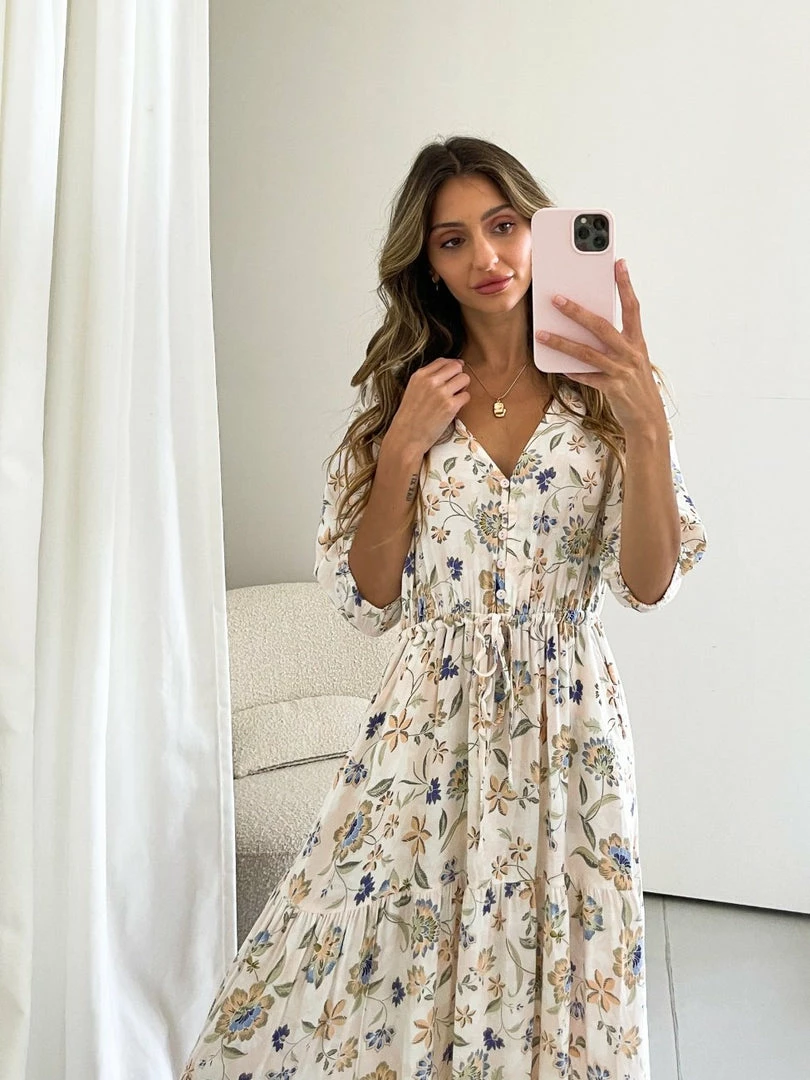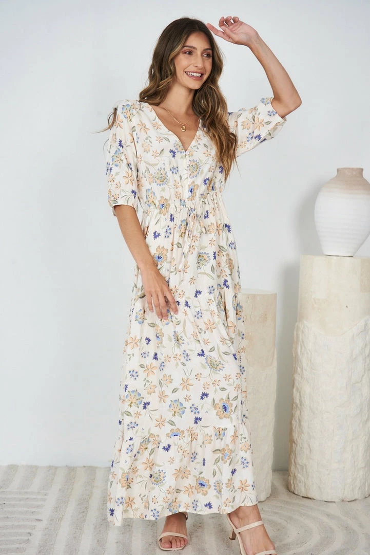 Our Howie Dress comes in a beige base with olive, dark purple & brown-toned floral print. This relaxed fit maxi features a v neckline with buttons on the front, drawstring waist and relaxed, layered skirt making this ideal for maternity wear. She pairs beautifully with a rattan bag and tan accessories.