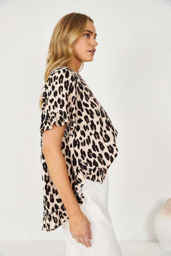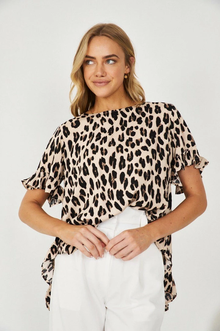 Our Marianella Top comes in tan base with brown and black-toned leopard print. It features a high round neckline and short sleeves with frill details for a relaxed, comfortable fit. This flowy top has frill details on the hem as well and pairs beautifully with basic pants for a fun casual look!.