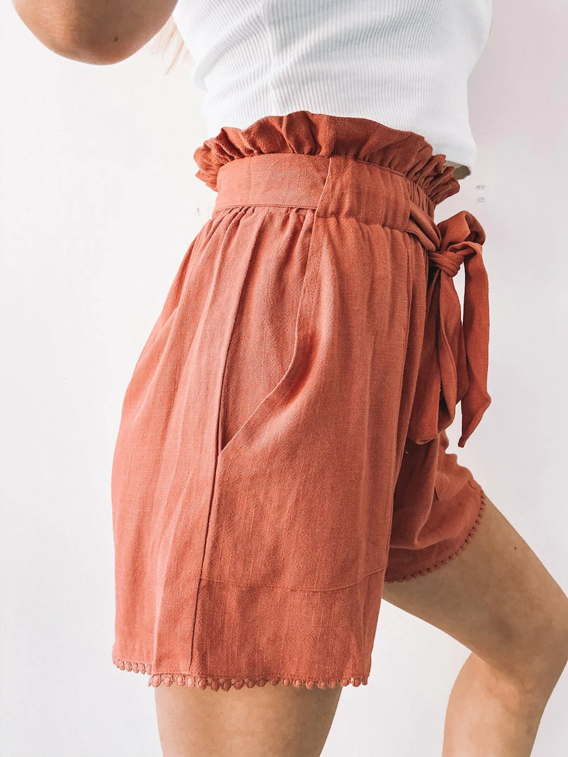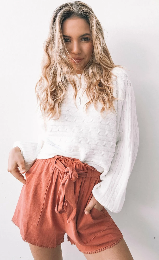 Our Refreshed Shorts come in a standout rust tone. It’s a lovely lightweight material ideal for the transition to Spring. These shorts are adorned with cute, micro pom poms along the hemline. Pair this with your fave wool pullover and white sneakers during the cooler months and your fave singlet during the warmer days to come.