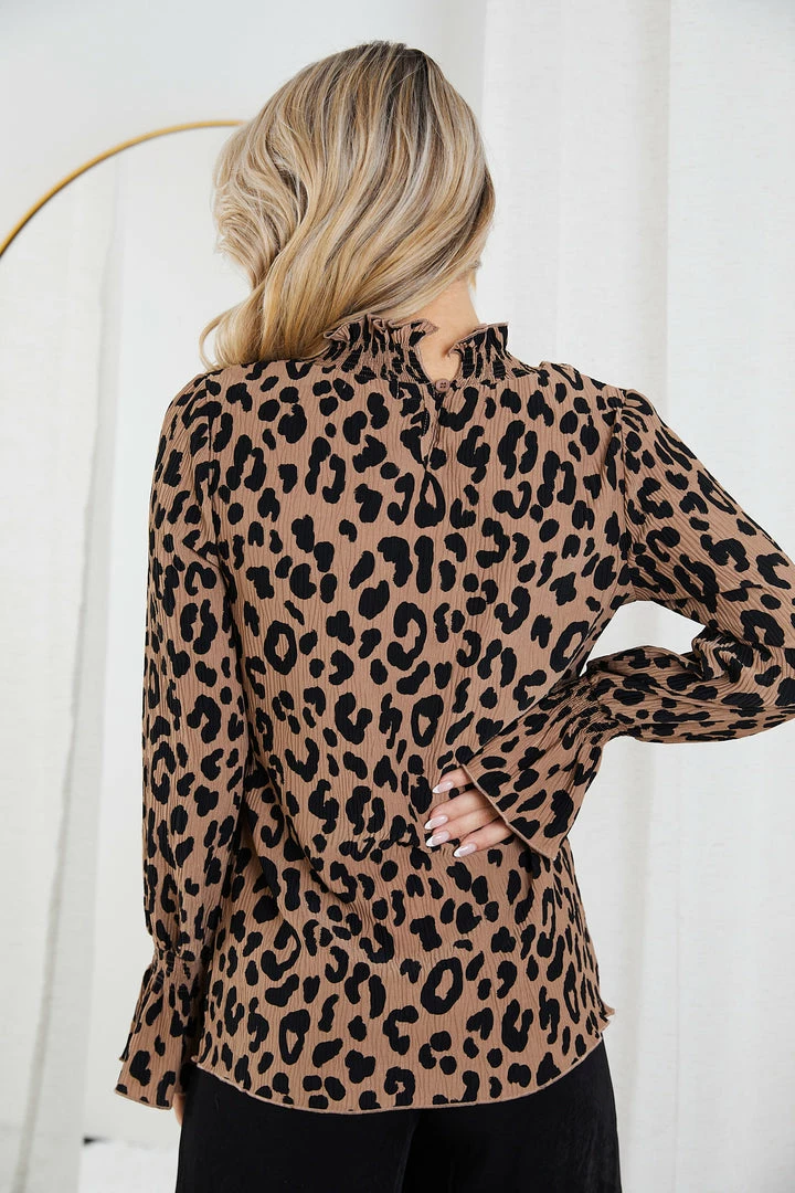 Our Sellia Top comes in a brown base and black leopard print pattern. Unleash your fearless self in this animal printed top featuring a high collar neckline complementing the face and long poet sleeves. Pair with jeans to wear it casually or glam up with a mini leather skirt.