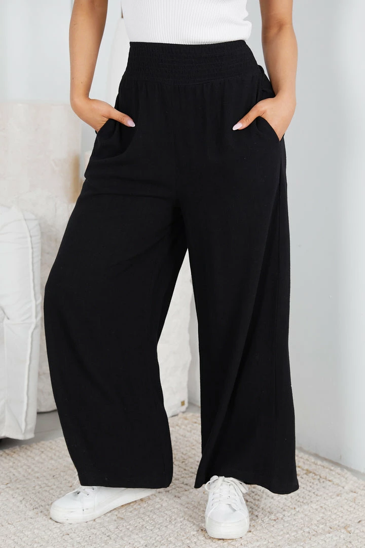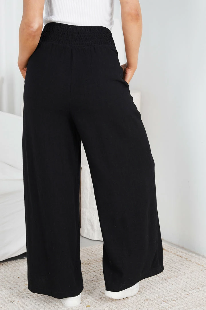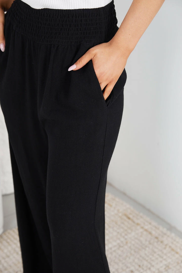 Our Shafaelle Pants come in a deep black colour. Perfect for a quick stroll to the downtown, these wide legged pants are cut from a lightweight linen fabrication that’s both comfortable and stylish. The waist features an elastic smock detailing and its hem falls on the ankle that is amazing when paired with heels to add height!