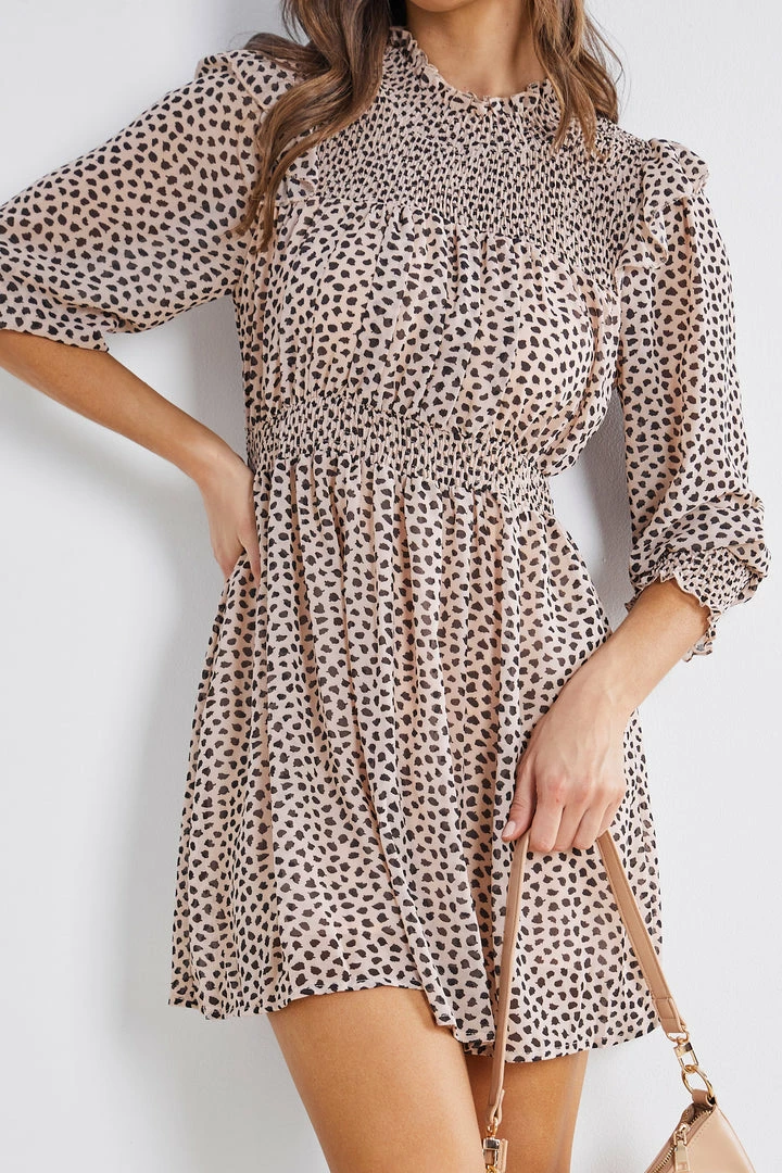 Our Tissuene Dress comes in a classy mocha base and prints in black. Enchanting colour and immaculate animal pattern, this mini features a high collar, long cuffed sleeves with ruffles on the shoulders, elasticated shirred waist and a flowy a-line skirt that falls above the knee. It pairs beautifully with a black closed high heeled shoes.