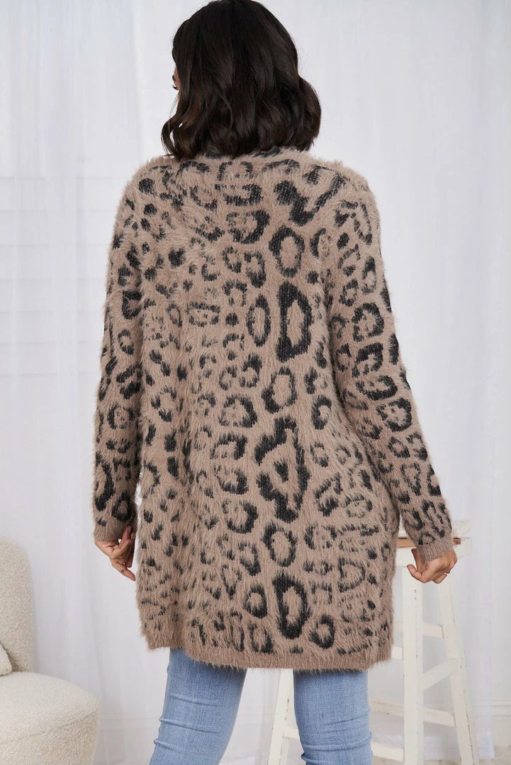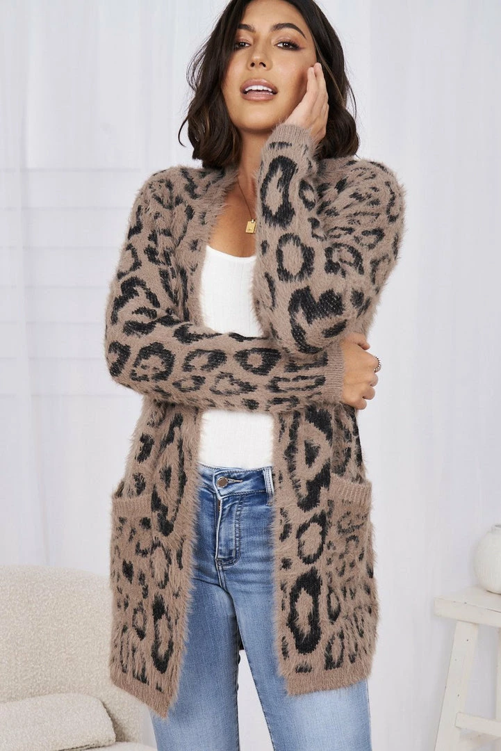 Our Delma Cardigan comes in a light brown and black tone leopard print. This open-style cardi features long relaxed sleeves for a warm, comfortable fit, as well as pockets on the front sides. This cute cardi is perfect for layering during the cold winter months!