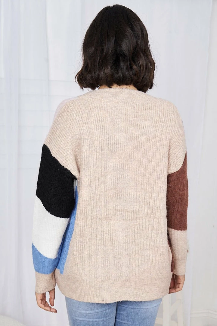 Our Dervila Cardigan comes in a blue, white, black, blush, beige & chocolate tone print. It features long relaxed sleeves & buttons on the front for a warm, comfortable fit. This cute cardi is perfect for layering during the cold winter months!