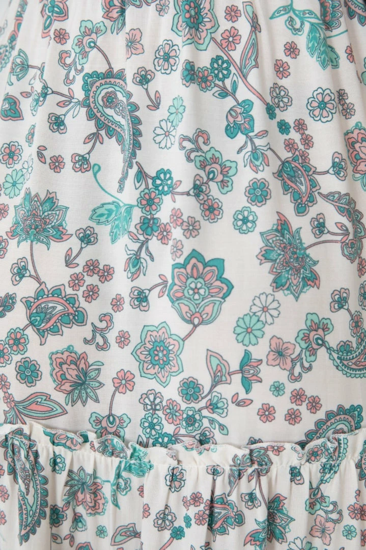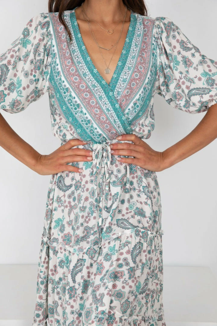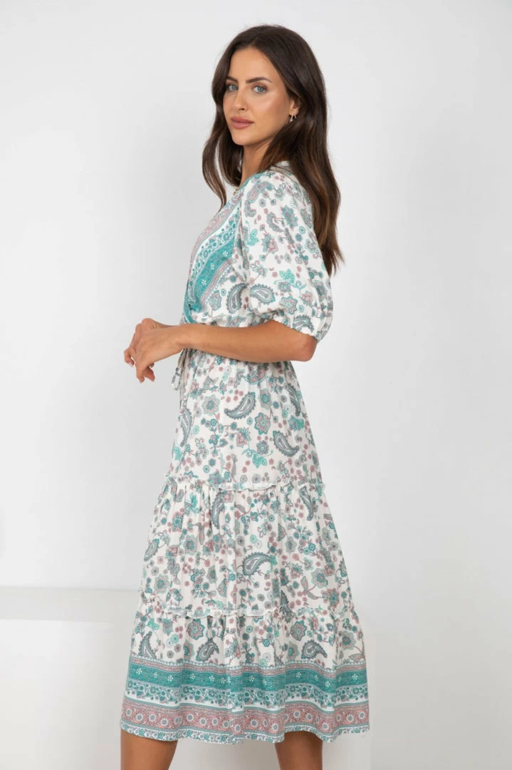 Our Karly Dress comes in a beige tone base, with a tuquoise and blush tone print. It features a v neckline and short sleeves for a relaxed, comfortable fit. This flowy midi pairs beautifully with heels for a fun look this spring season!