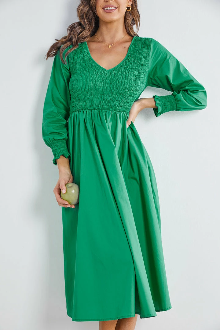 Our Paperine Dress is in a rich green colour. Ready to groove to the beat of fun in this midi that features a curved v-neckline, smocked bodice, long sleeves with frilled cuffs and a-line skirt allowing easy movement. Match it with wrap espadrilles wedges and a micro bag for a stroll around the park outfit.