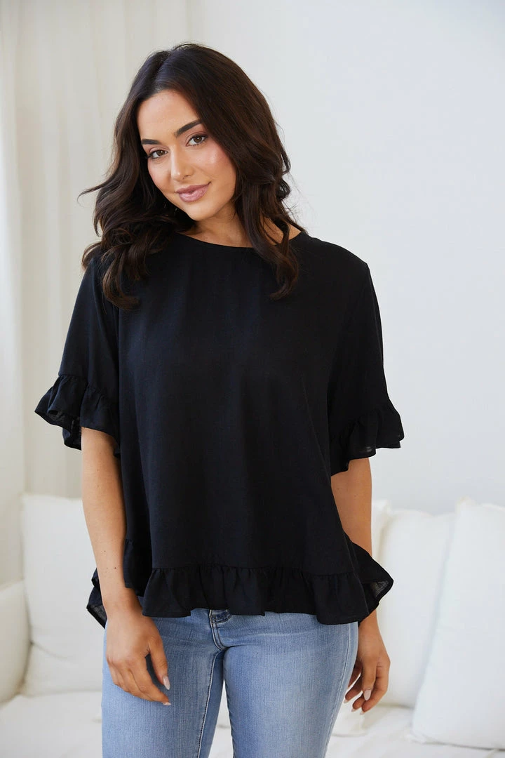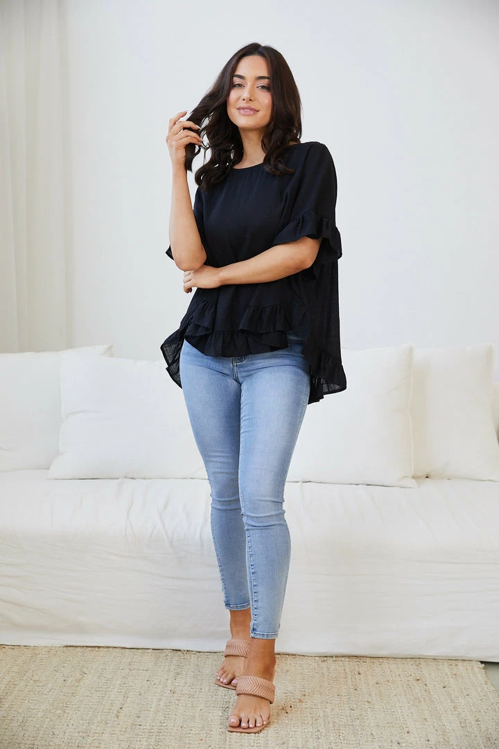 Our Ralene Top comes in a classic black tone in a relaxed fit. The ruffle detailing and asymmetric hemline are playful additions to this easy-to-wear piece, ideal for throwing on and taking on your day.