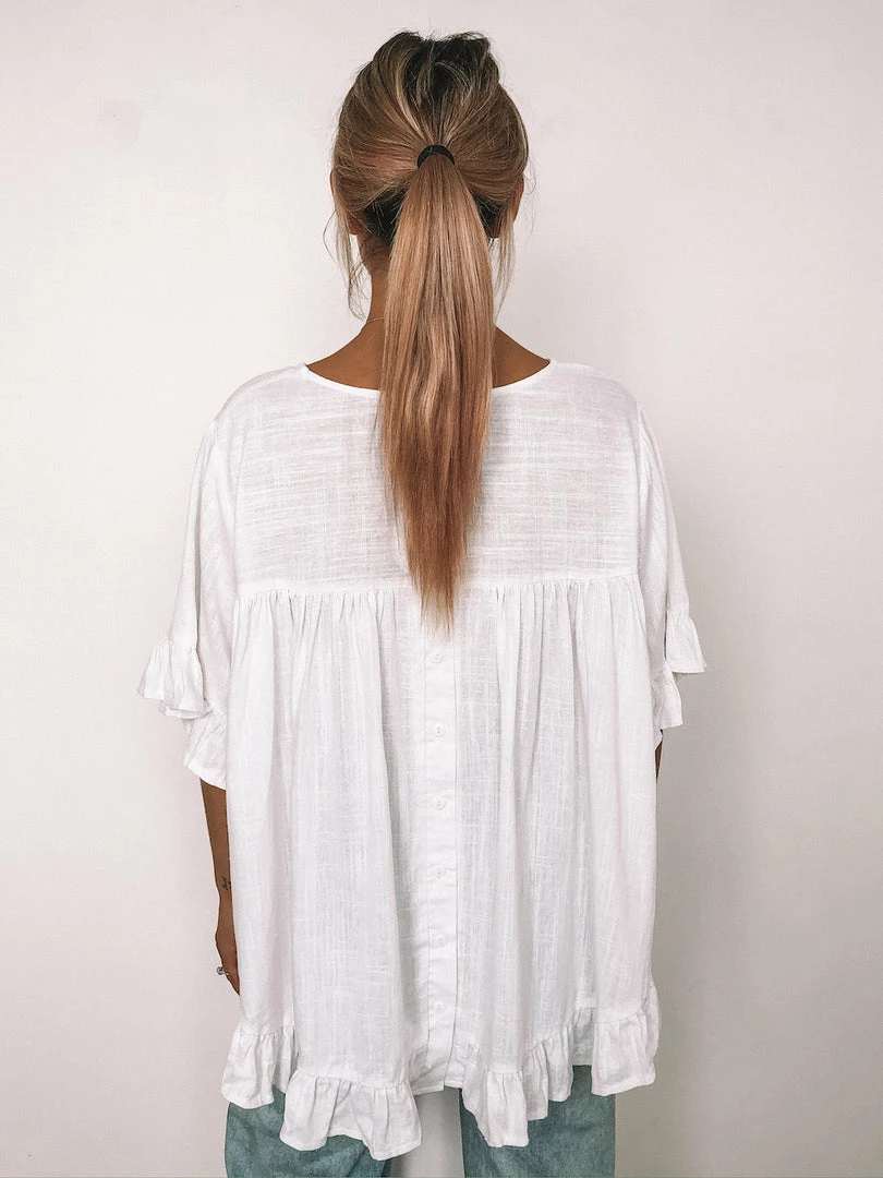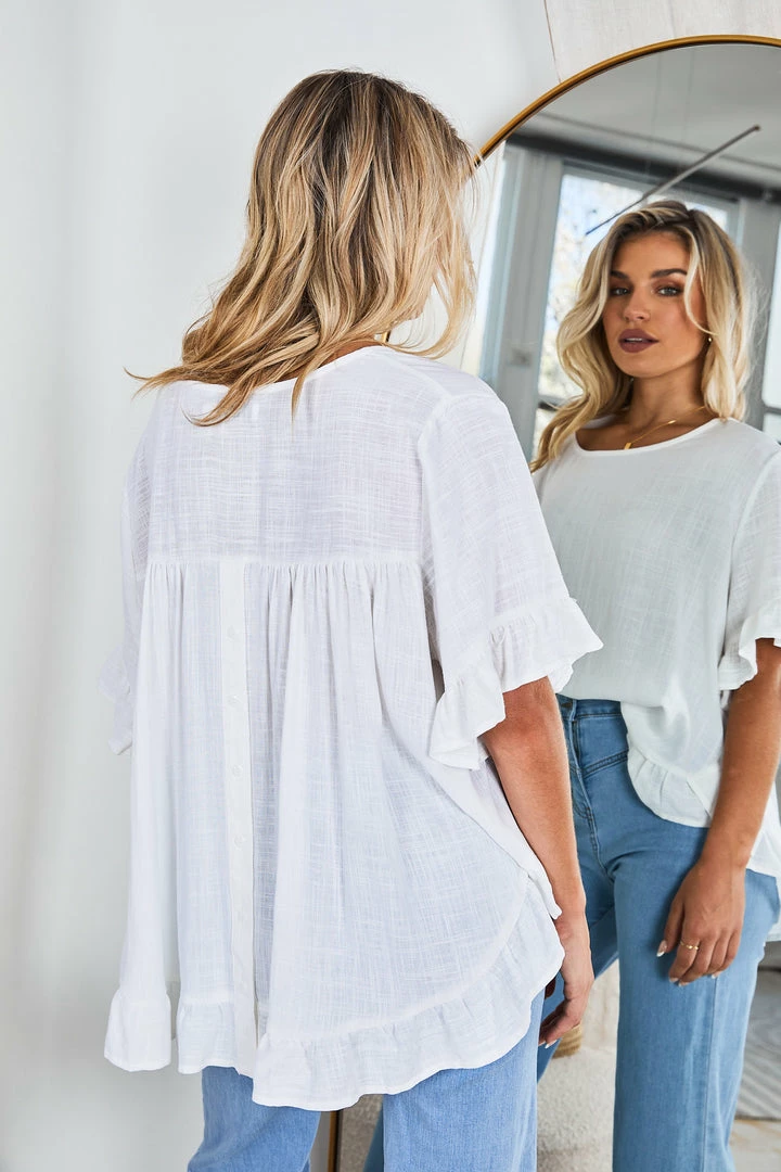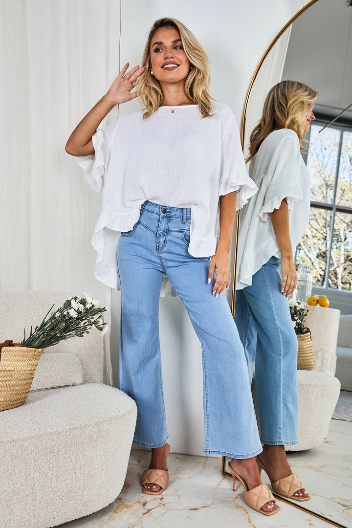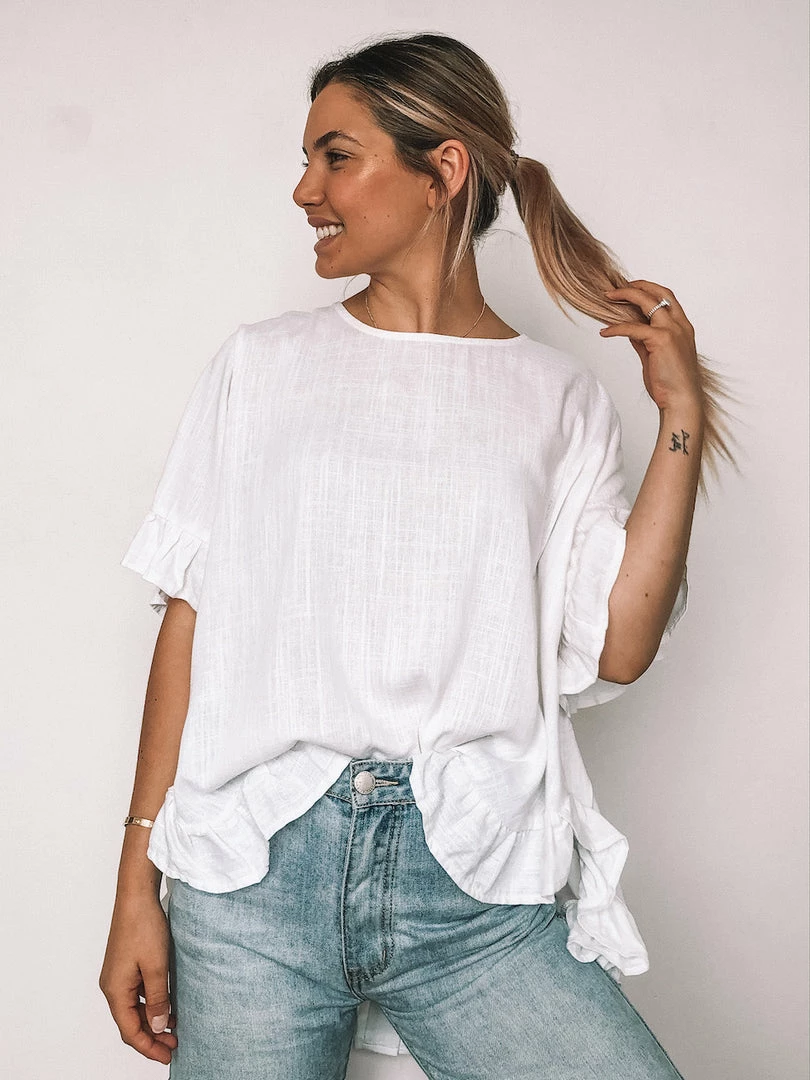 Our Ralene Top comes in a classic white tone in a relaxed fit. The ruffle detailing and asymmetric hemline are playful additions to this easy-to-wear piece, ideal for throwing on and taking on your day.