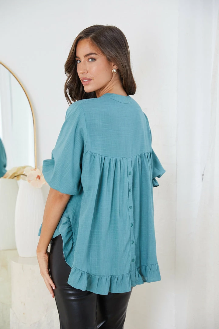 Our Viviette Blouse comes in a charming dark green colour. Adding excitement to your rotation of everyday look, this girly top is designed with a mandarin collar, soft v-neckline, quarter sleeves and high low edge. The frills on the cuffs and hem are lovely features that pairs well with our Tasanee Pants – Black and a pearl bracelet!