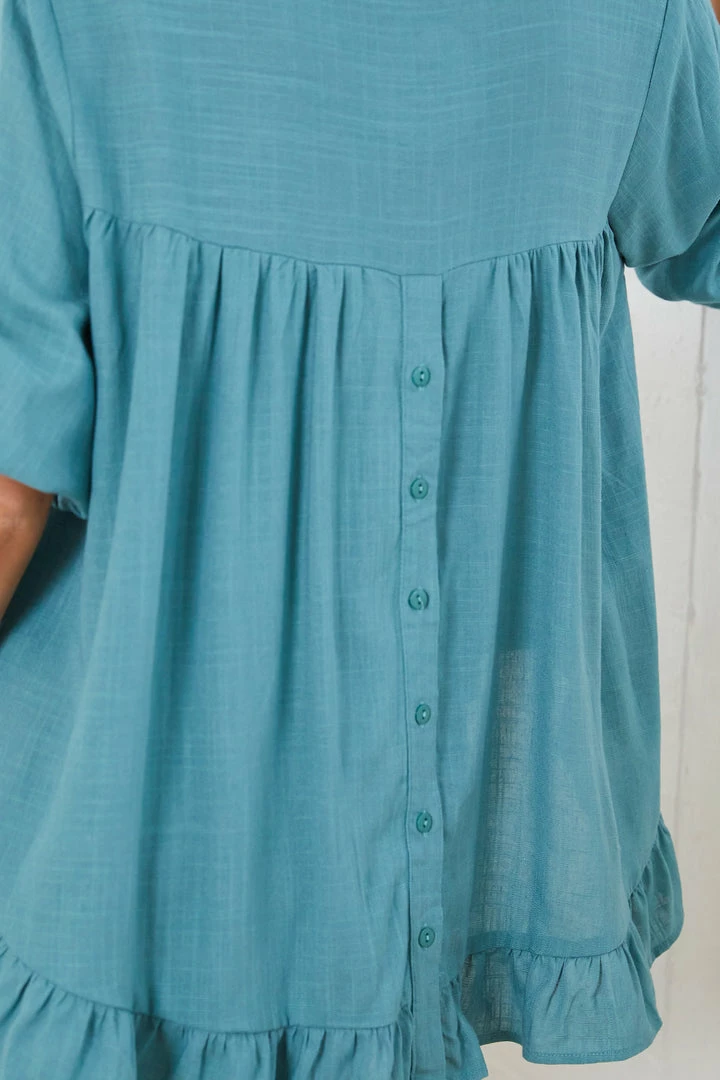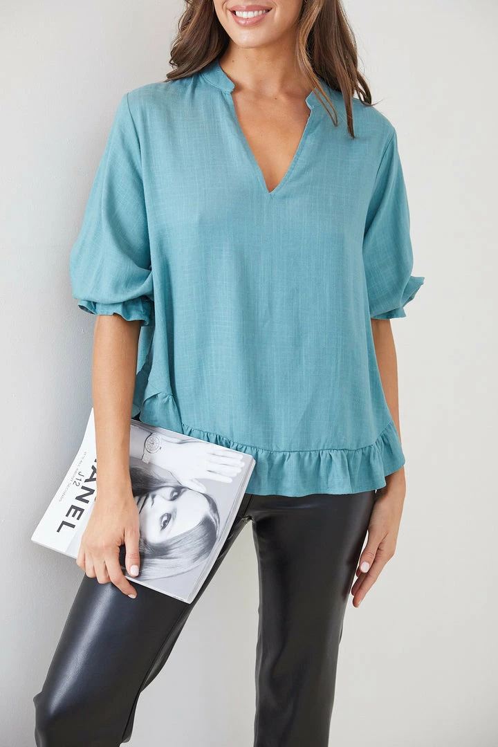- Key Features: Collar with soft v-neckline. 3/4 Sleeves. Frills on cuffs and hem.