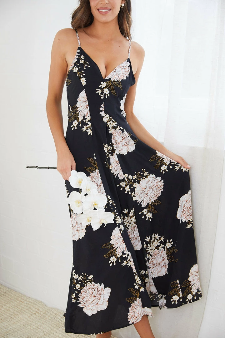 Our Wilhemina Dress comes in a posh black base with floral prints in blush and moss green. An envy worthy piece, this maxi features spaghetti straps, soft v-neckline and tight fit on the waist that flowingly flares towards the hem. Show off your legs through the front slit and pair with classic heels!