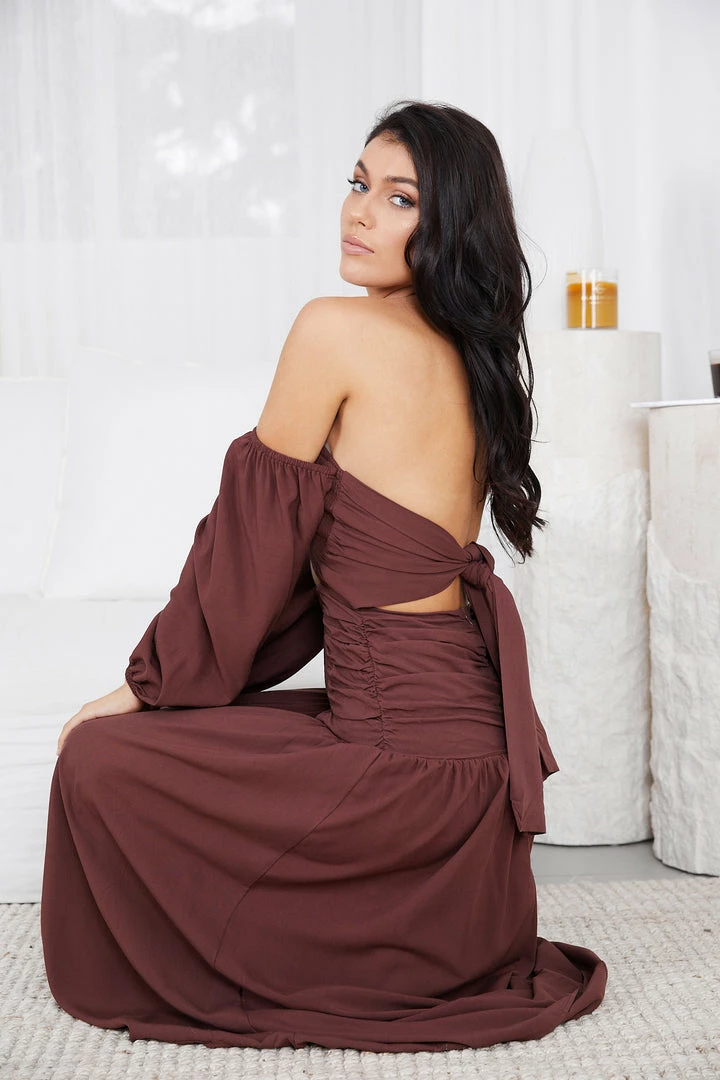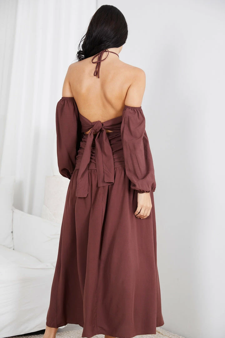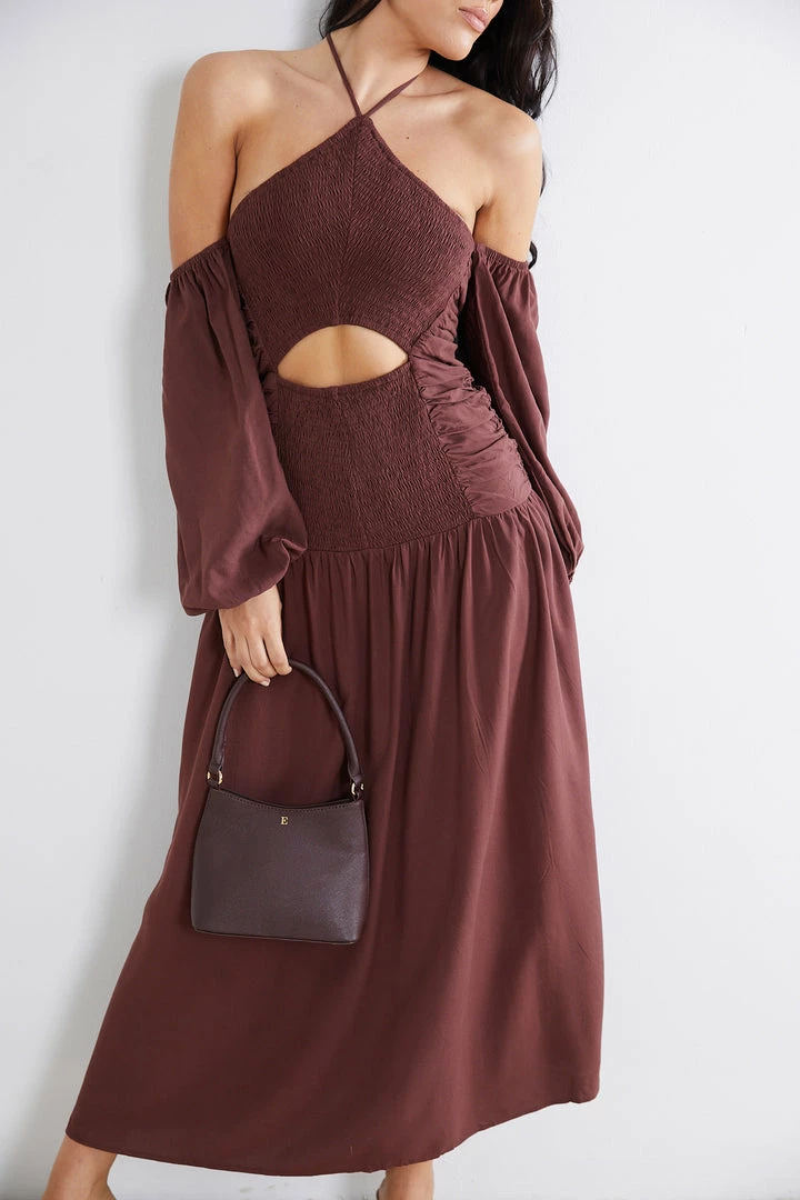 Our Timotania Dress comes in a chocolate brown colour. Living out wanderlust dream in this boho chic maxi that features a halter neckline with slim tie fastening, long cold shoulder sleeves elasticated at the cuffs, waist cutout, maxi length, ruching details on the side and smocking on the bodice and hip area. Style yours with a strappy flat sandals and a straw bag!