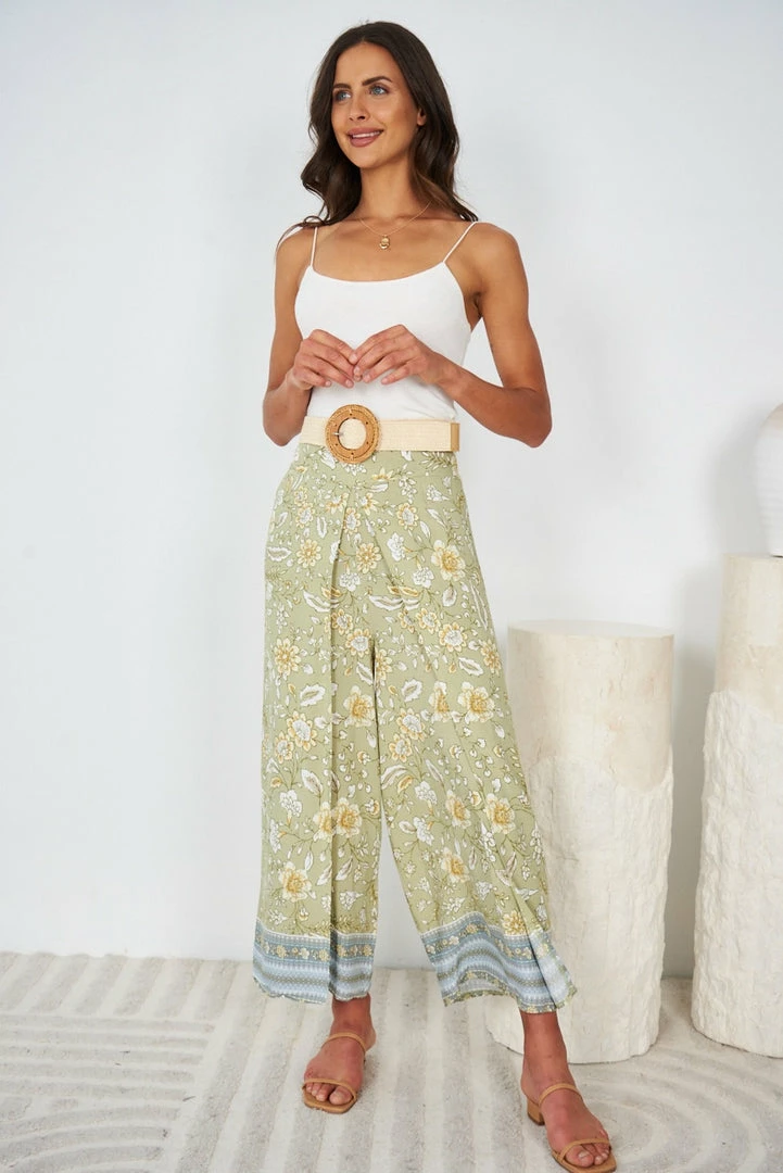 Our Jerry Pants come in an olive green tone base, with a yellow, light blue & white tone print. It features a midi-length and a wide-leg silhouette. These flowy pants pair beautifully with a basic top for a fun spring look!.